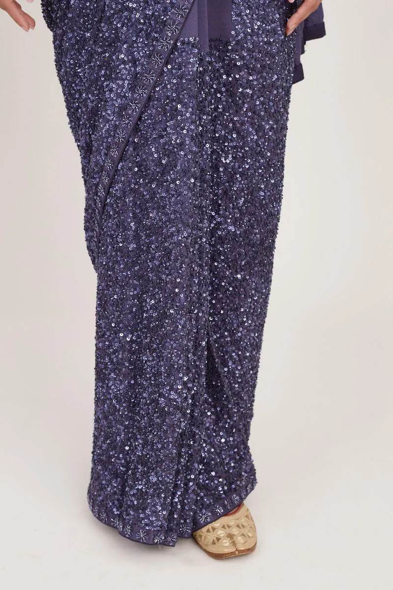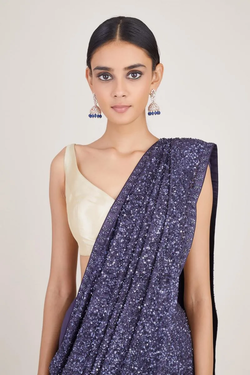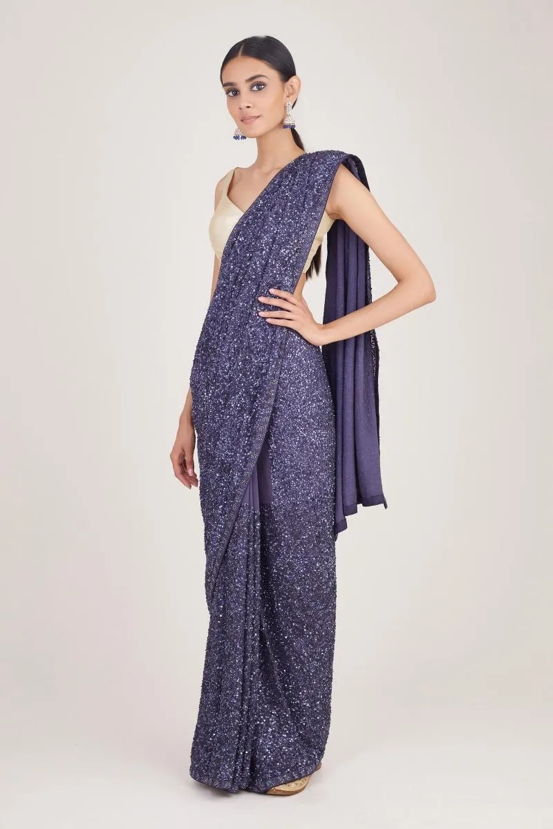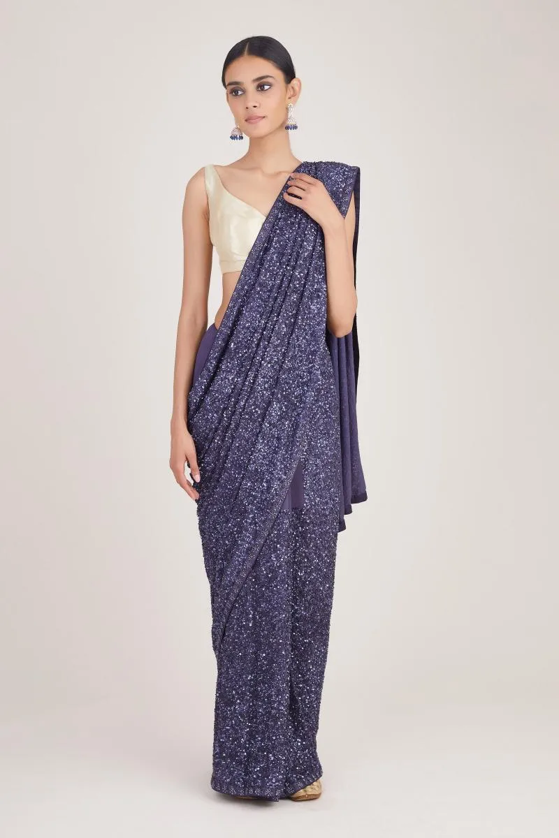 Bring the sparkle and the party in a shiny sequin embellished georgette saree. The satisfyingly light fabric is decorated with a sky of sequins all over it, almost mirroring the shine of a beautiful night sky. Coupled with the royal flavour of the colour, the attire features floral cut dana and sequin work along the border, reflecting light like stars in the sky. It is accompanied by an unstitched blouse.