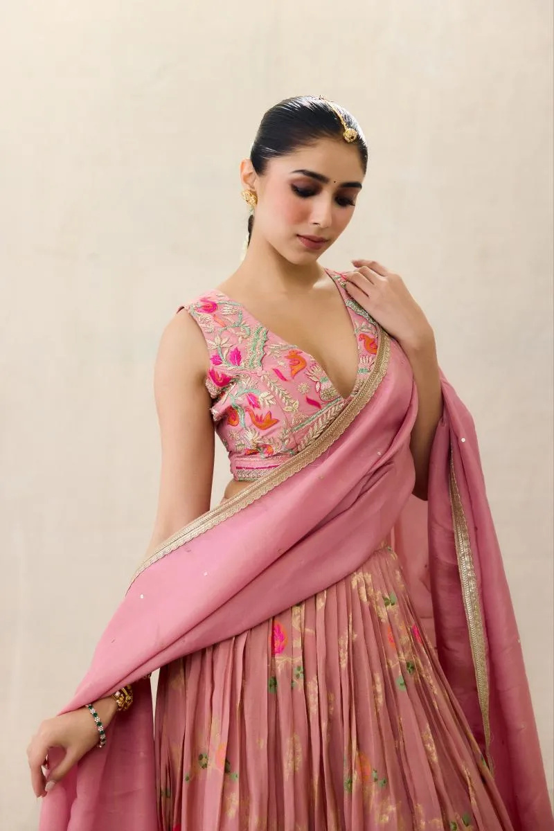 Professional dry-cleaning only. The garment should be kept in Soft Muslin fabric. Do not spray perfume directly on garment. Avoid mothball use. Kindly keep the garment in moderate climate as same of the embroidery material tends to react with the weather change.