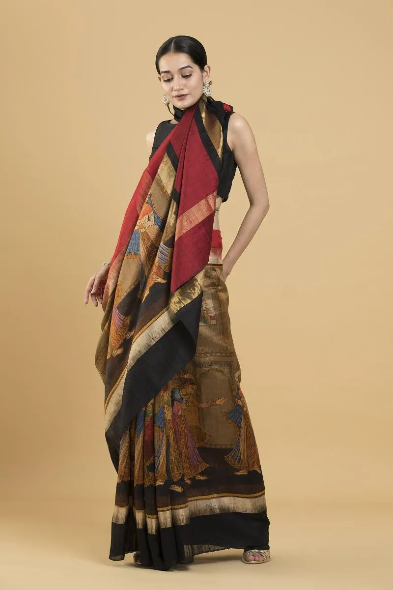 Black Digital Printed Tussar Saree