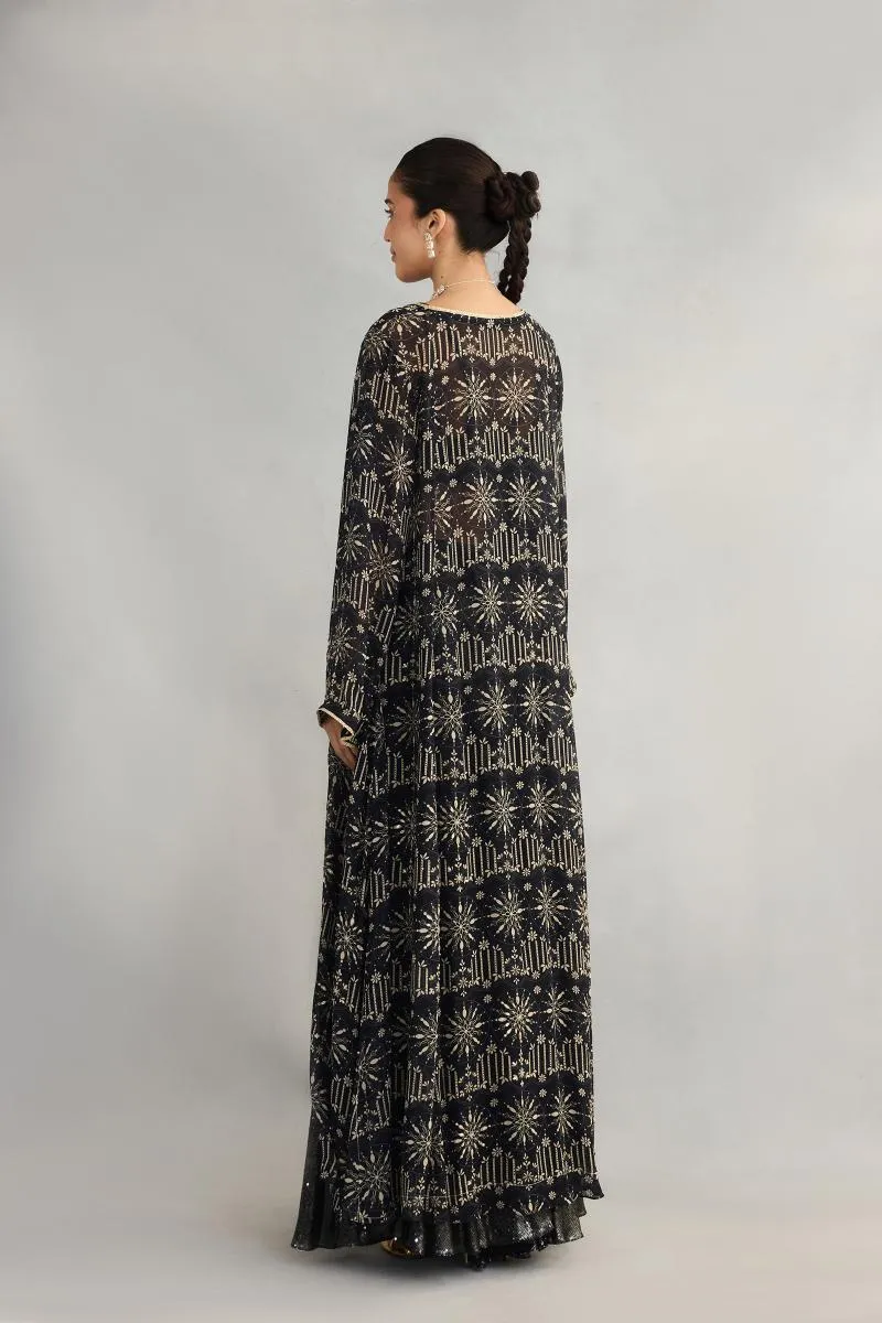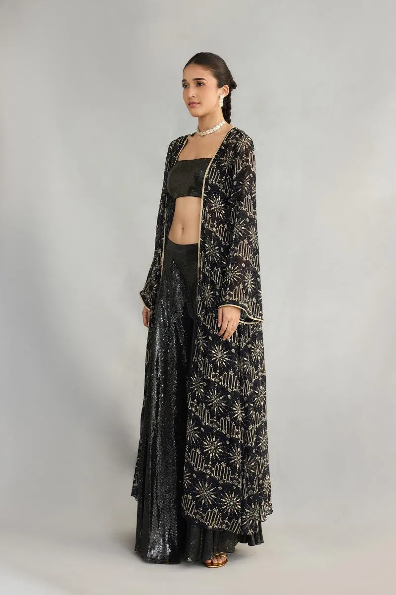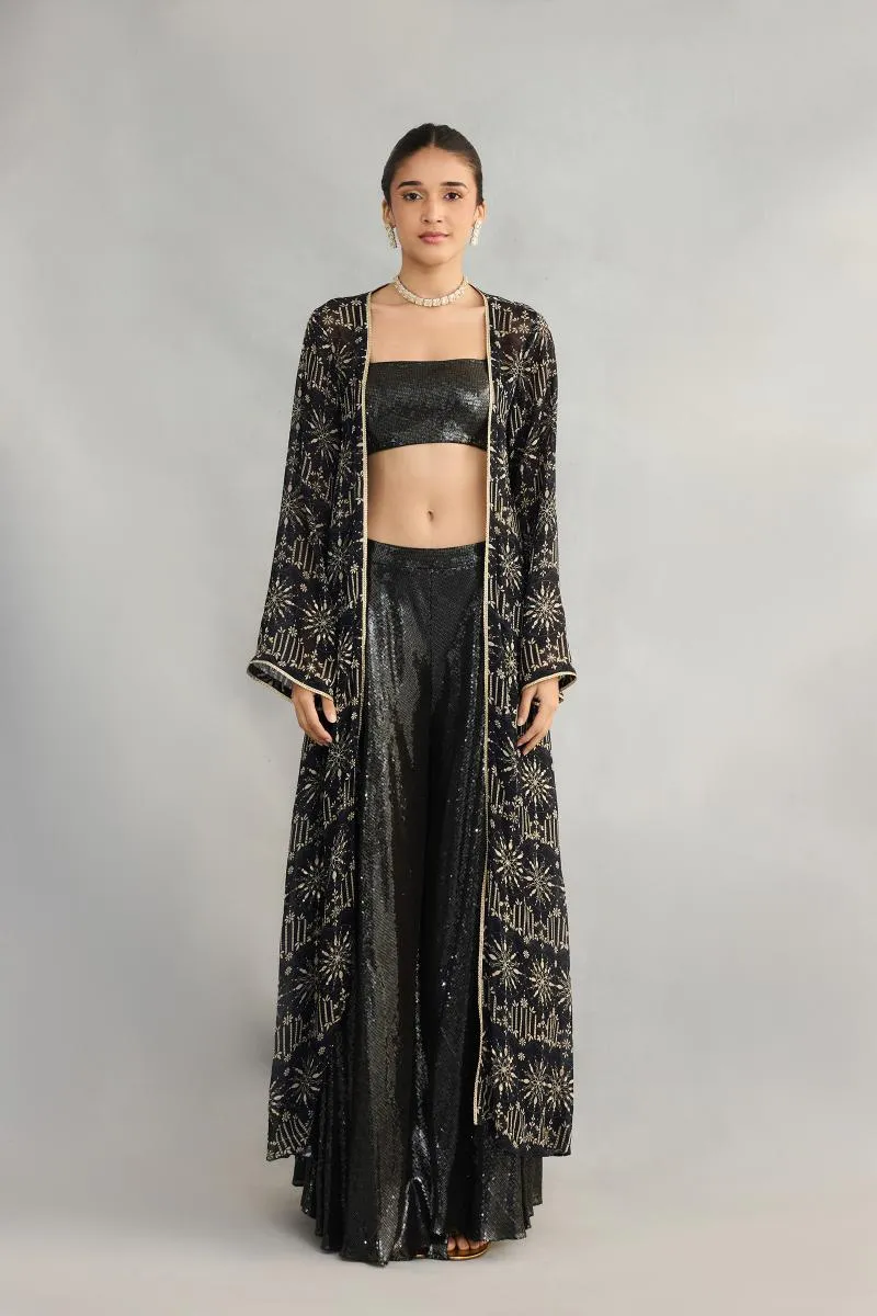 Black Printed Sequin Cape Suit