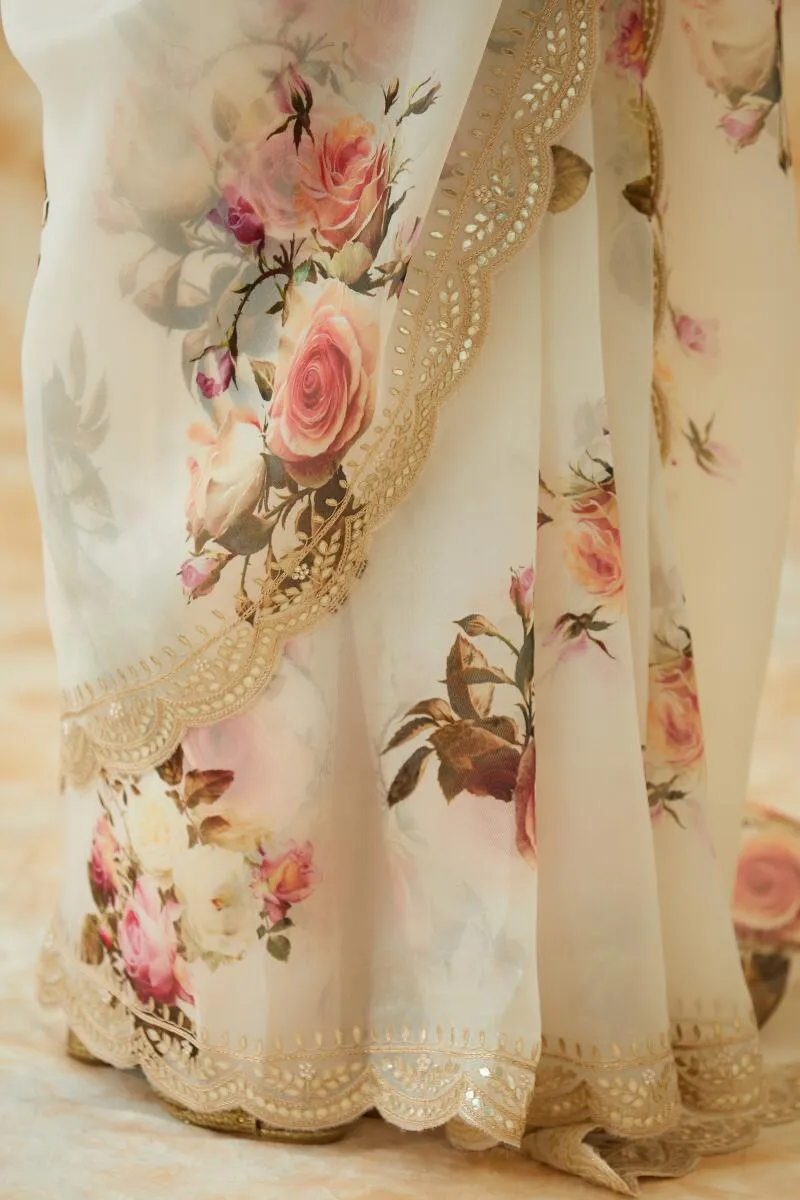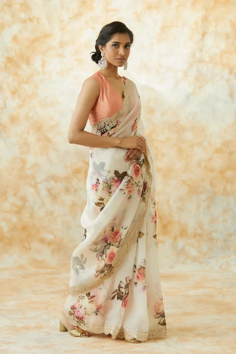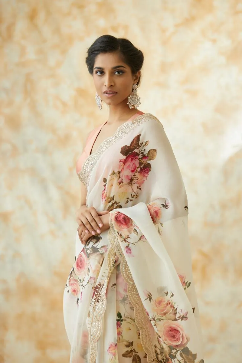 Cream Organza Floral Print Saree