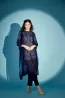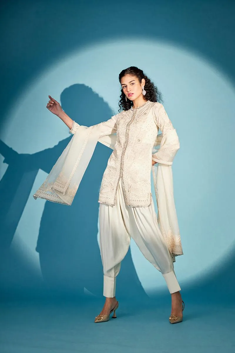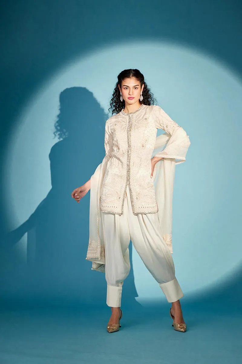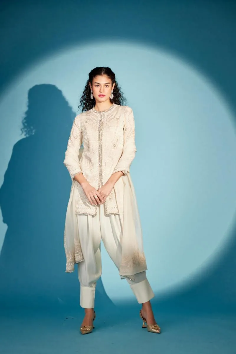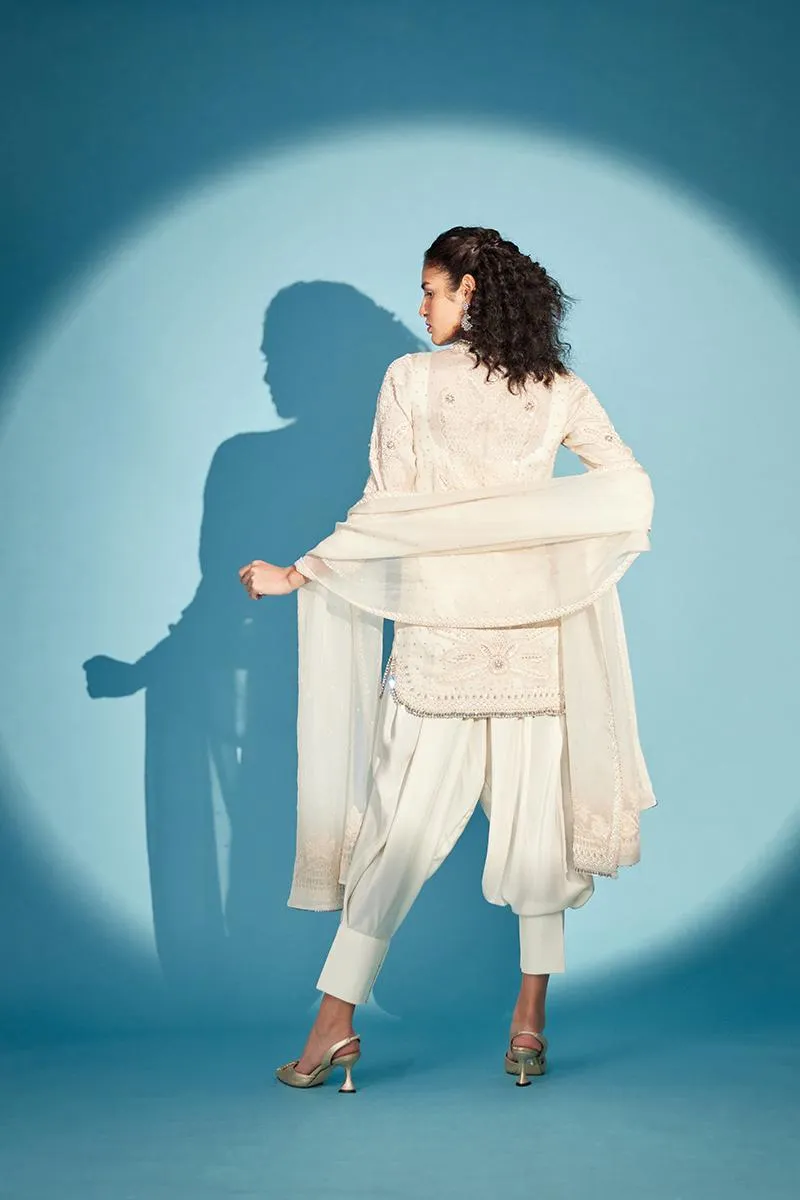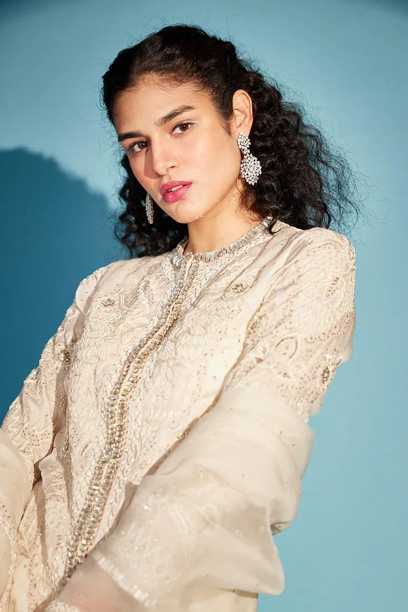 In frame is a crème chroma kurta set crafted in organza with a semi-front open placket studded with gemstones also trimming all the hem lines. The kurta is embossed with floral motifs in thread meticulously accentuated with cutdana, Swarovski’s and sequin. Paired with a crepe bustier under the sheer sartorial. The organza dupatta is crafted with identical textural artistry. The suit pairs with our statement dhoti inspired pants tailored to perfection.