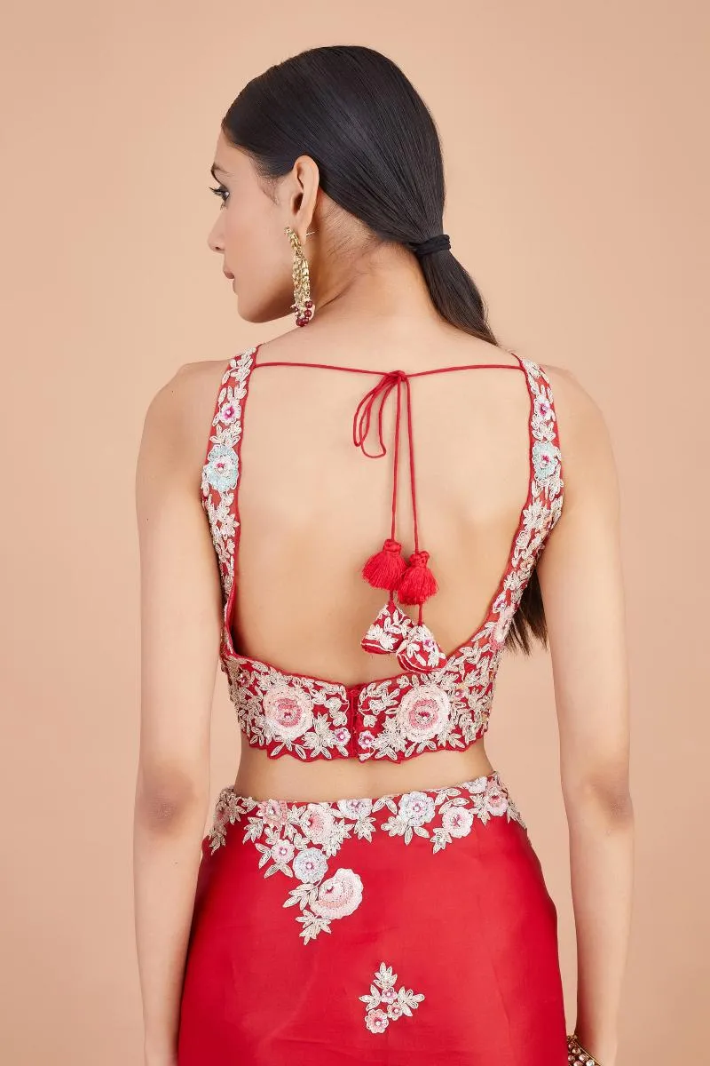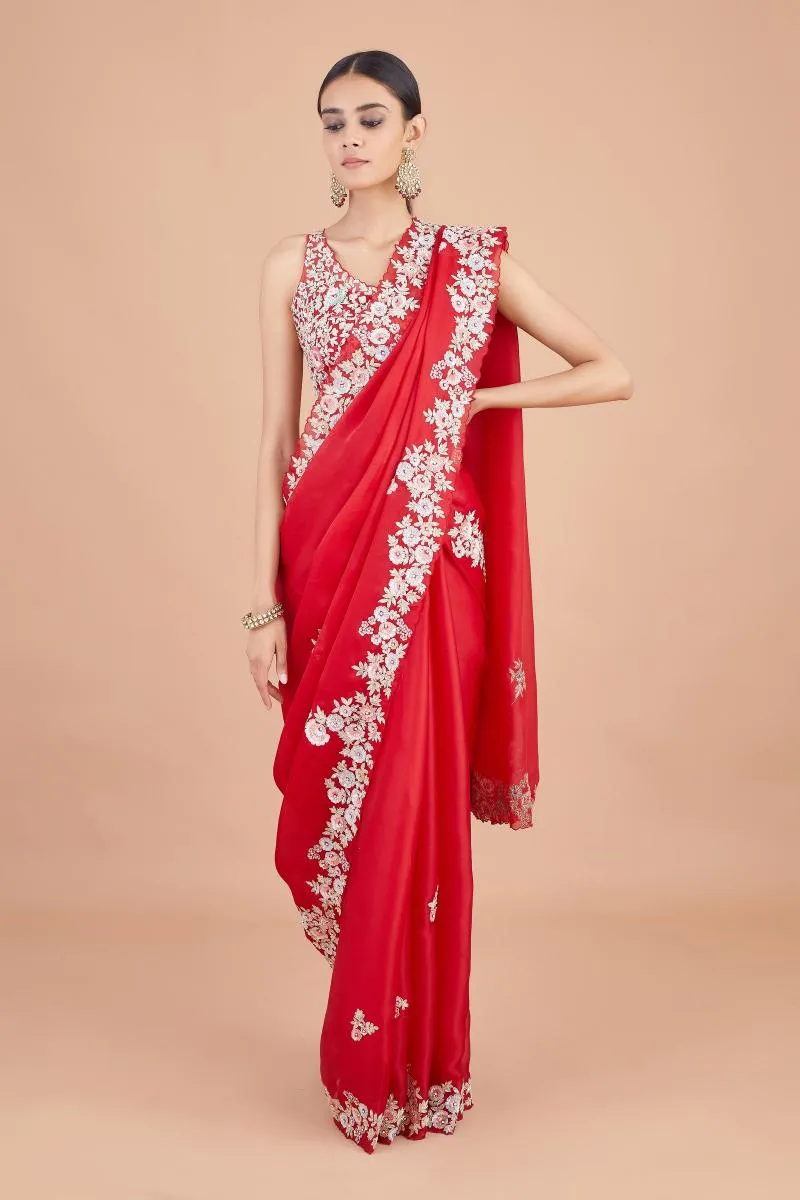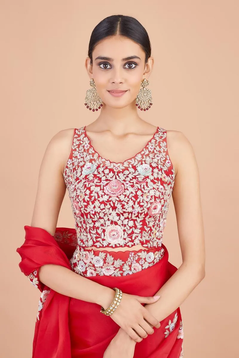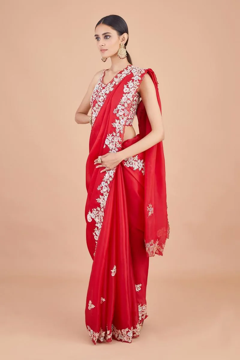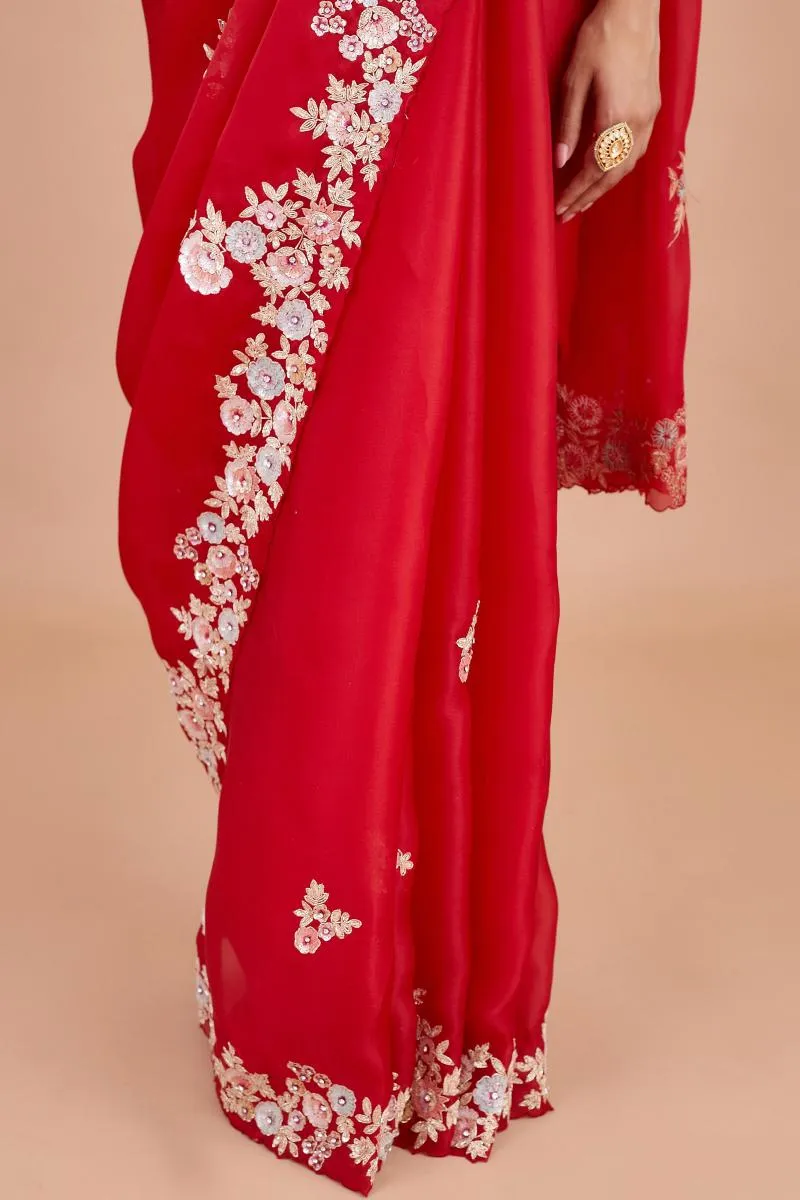 Classic red meets a riveting nine yards of electrifying crimson in organza. This summer-perfect selection is a glamourous design to own with its intricate scallop border featuring a floral motif embellished with sequins, cut dana work , swarovski crystals and dabka work. The floral bootis bloom in a pink-red聽ombre style all over the saree. It is accompanied by a stunning blouse with the same design artistry and craft that features a deep neck with dori tassels on the back.