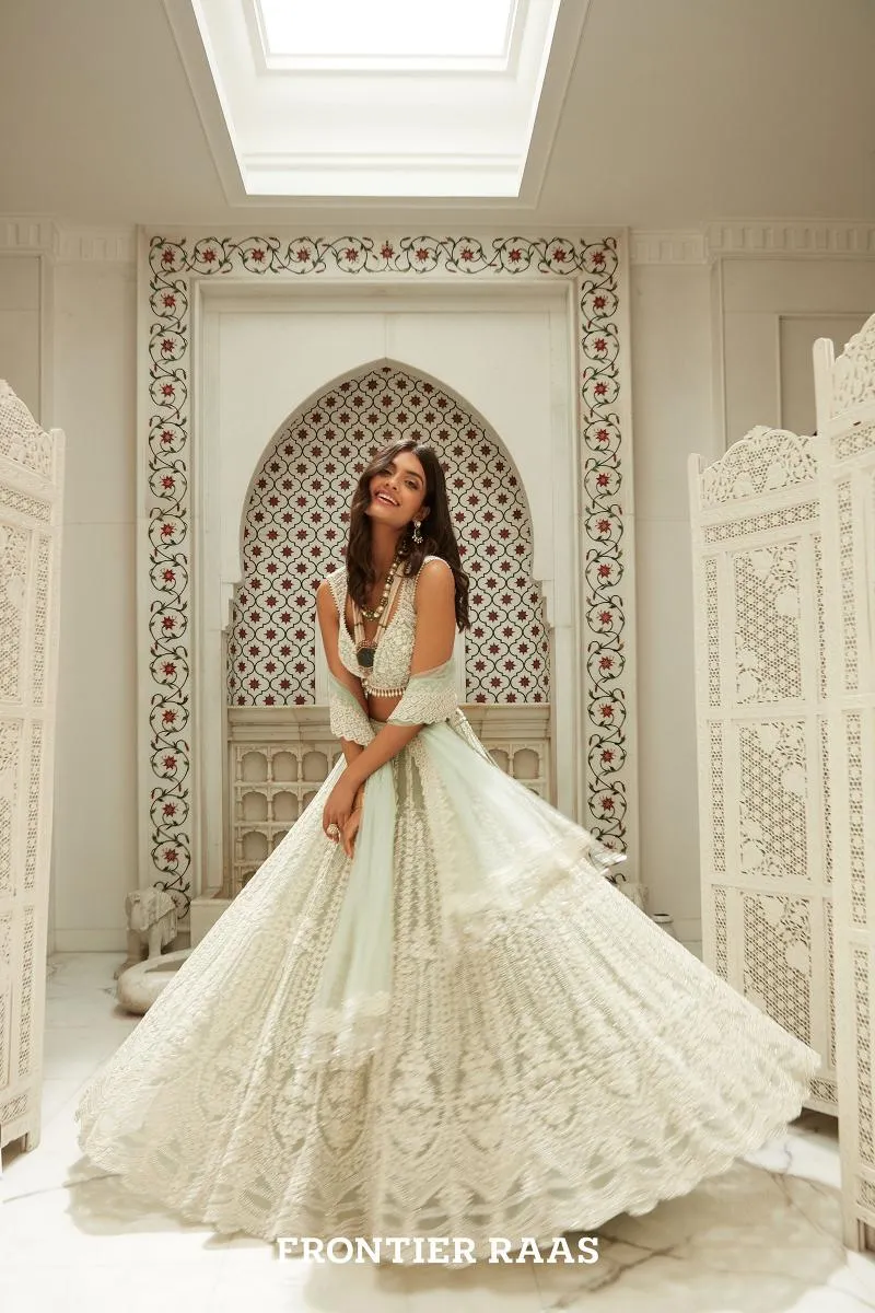 The vivid mint hued lehenga perfectly complements the spirits of spring. Its spell-binding intricacy brought alive by our master artisans in the craft forms of pearls, cutdana and beads. This exquisitely rich organza lehenga wraps you in a luxurious lightness with its stellar designer cut embellished blouse. Cascading floral lines and floral bunches set against a canvas fabricated in net. A vibrant Mint lehenga that wraps you in contemporary eleganza with a sheer net dupatta to match. The blouse and the dupatta is accentuated with a series of delicate drop tassels that finishes the look and takes the style element of the timeless silhouette a notch up.