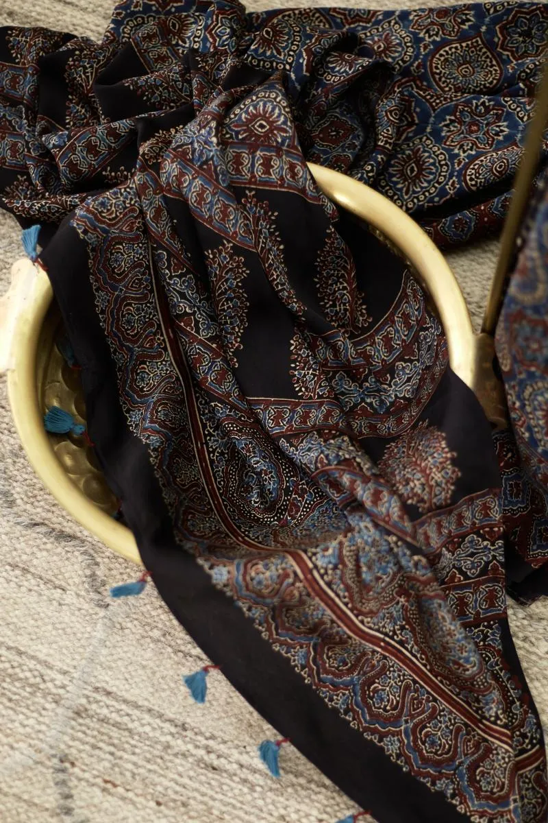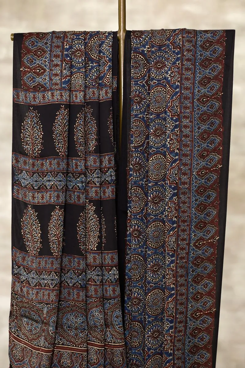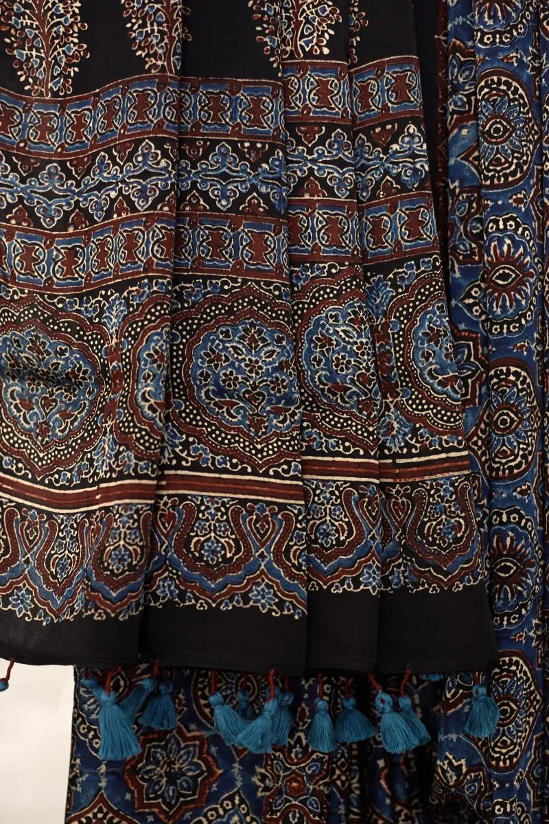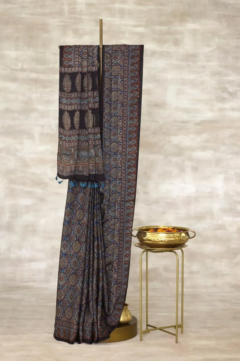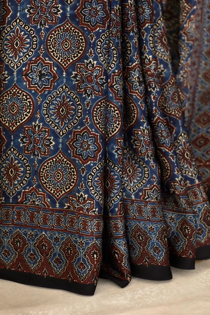 Indigo Blue Ajrakh Print Silk Saree