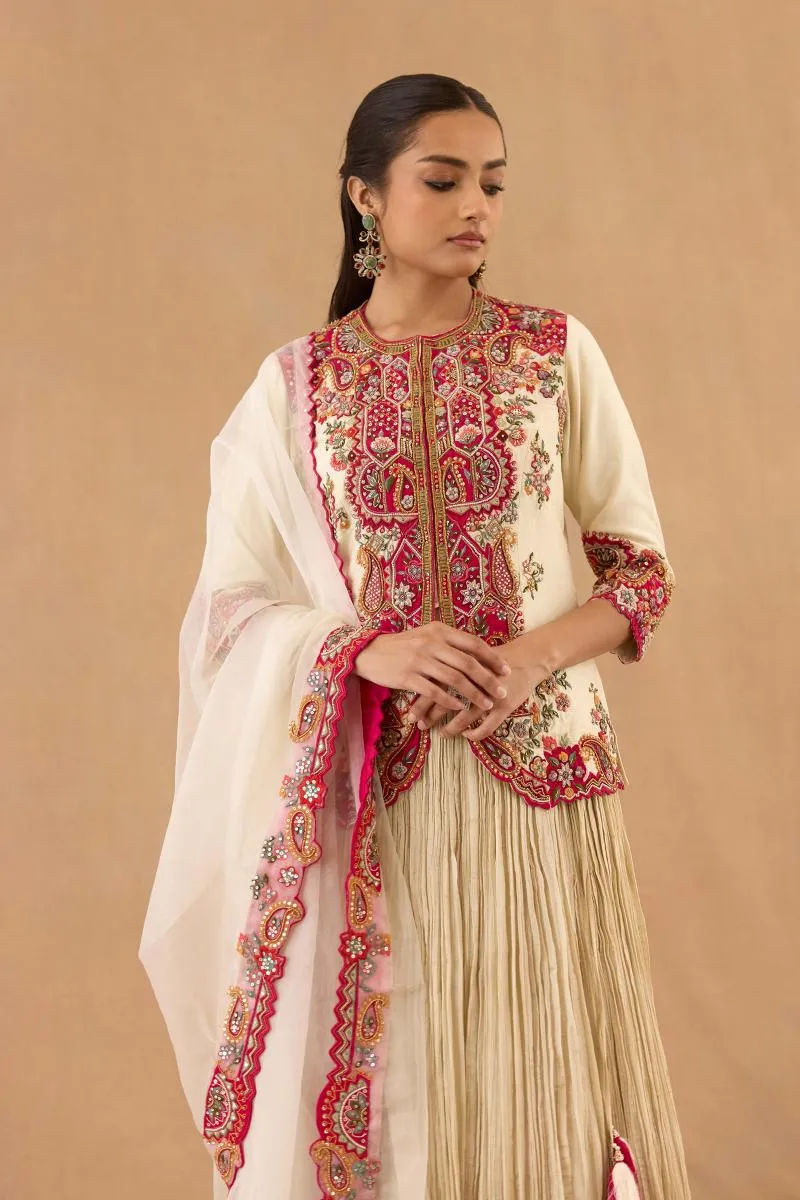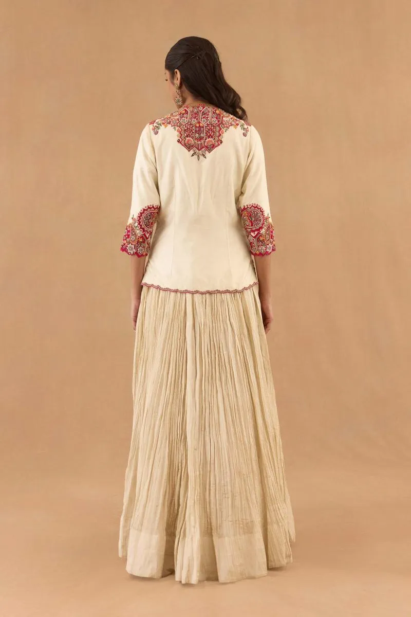Professional dry-cleaning only. The garment should be kept in Soft Muslin fabric. Do not spray perfume directly on garment. Avoid mothball use. Kindly keep the garment in moderate climate as same of the embroidery material tends to react with the weather change.