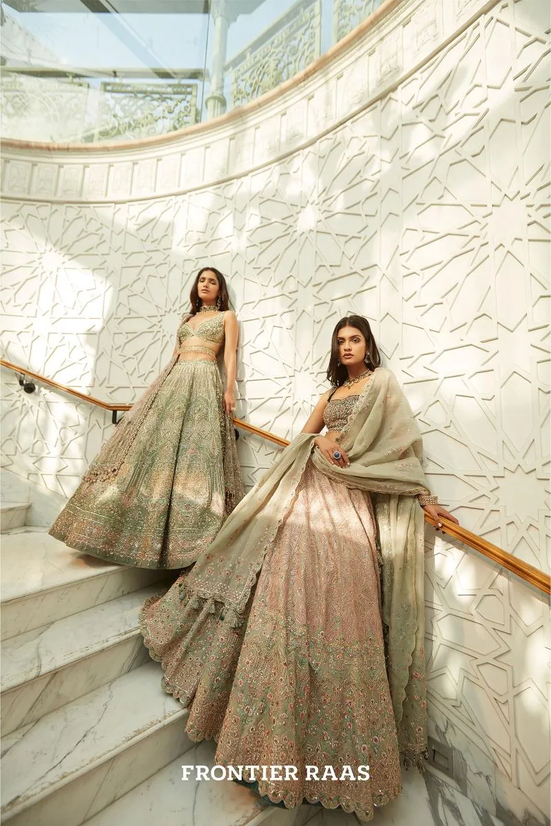 A blissful dance of water and matter – Euphoria of architectural reflection in water. Revel in the sheer hues of sublime colors that run through Taraasa’s Jade Green Organza Lehenga accentuating contemporary accents crafted for the modern bride crafted in a an intricate web of sequin, cutdanna, dabka and beadwork featuring on a well tailored blouse fabricated in organza and a dupatta in net to match. The exquisite tone on tone silhouette features masterful appliqué work that is a real treat for the eyes.