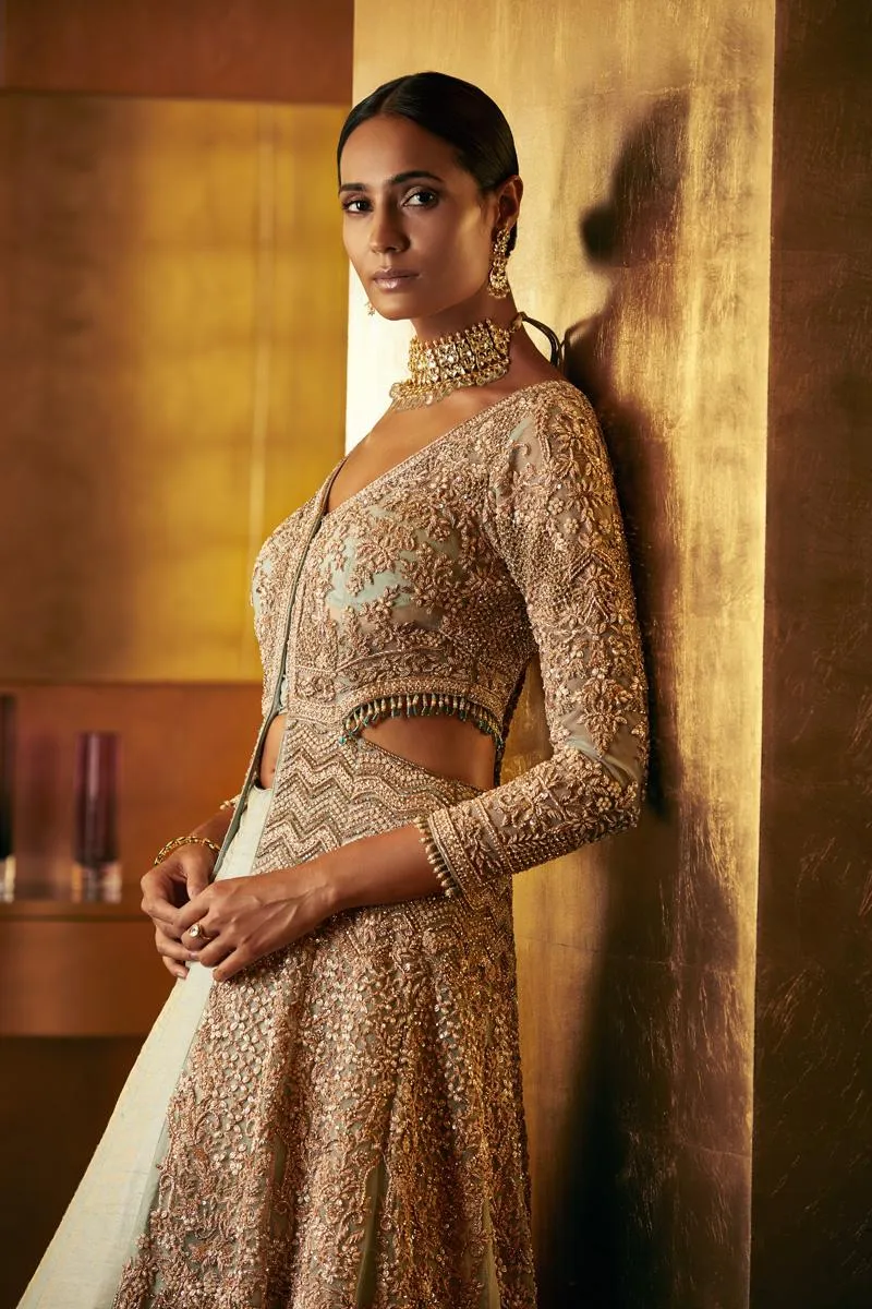 Light Blue Trail Long Voguish net Jacket with eye cuts at the waist and front open, embellished with traditional grid and floral patterns, done in mukaish, dabka, nakshi and pearl work. Tonal shimmer raw silk kalidar lehenga with heavy bottom border. Coupled with broad zardozi border and butties all over on ombre net dupatta.