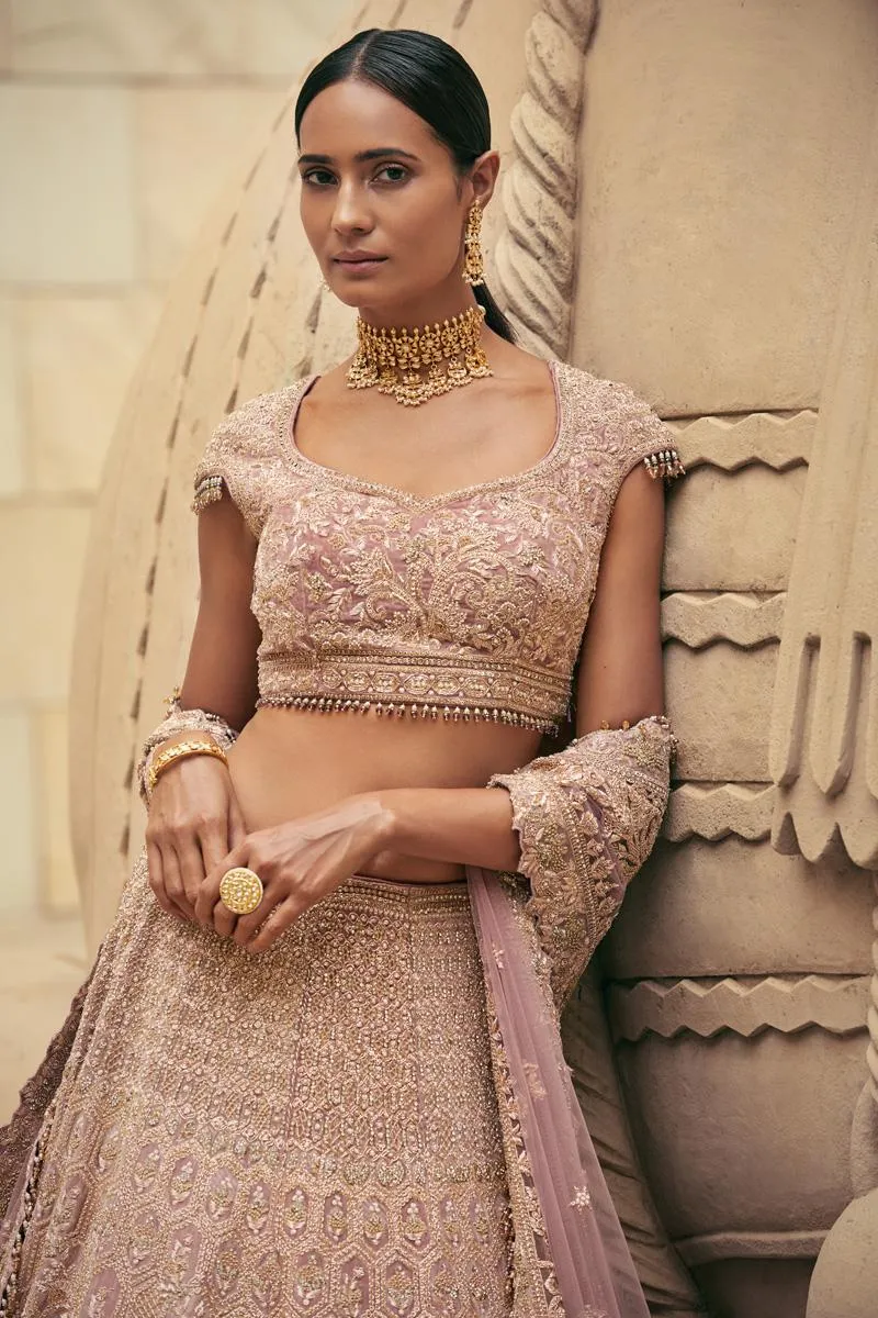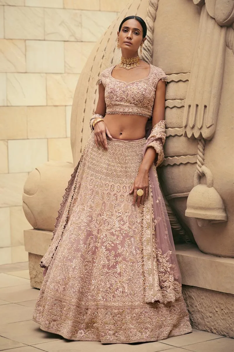 Lilac velvet sweetheart neckline and cap sleeves blouse embellished with goodly floral jaal done with dabka, nakshi ,pearl and cutdana work, waistline decorated with pearl and crystal tassels. Kalidar lehenga embroidered in zardozi dense grid and floral jaal.Scalloped heavy border and butti on net dupatta. It took 1000 hours in completion.