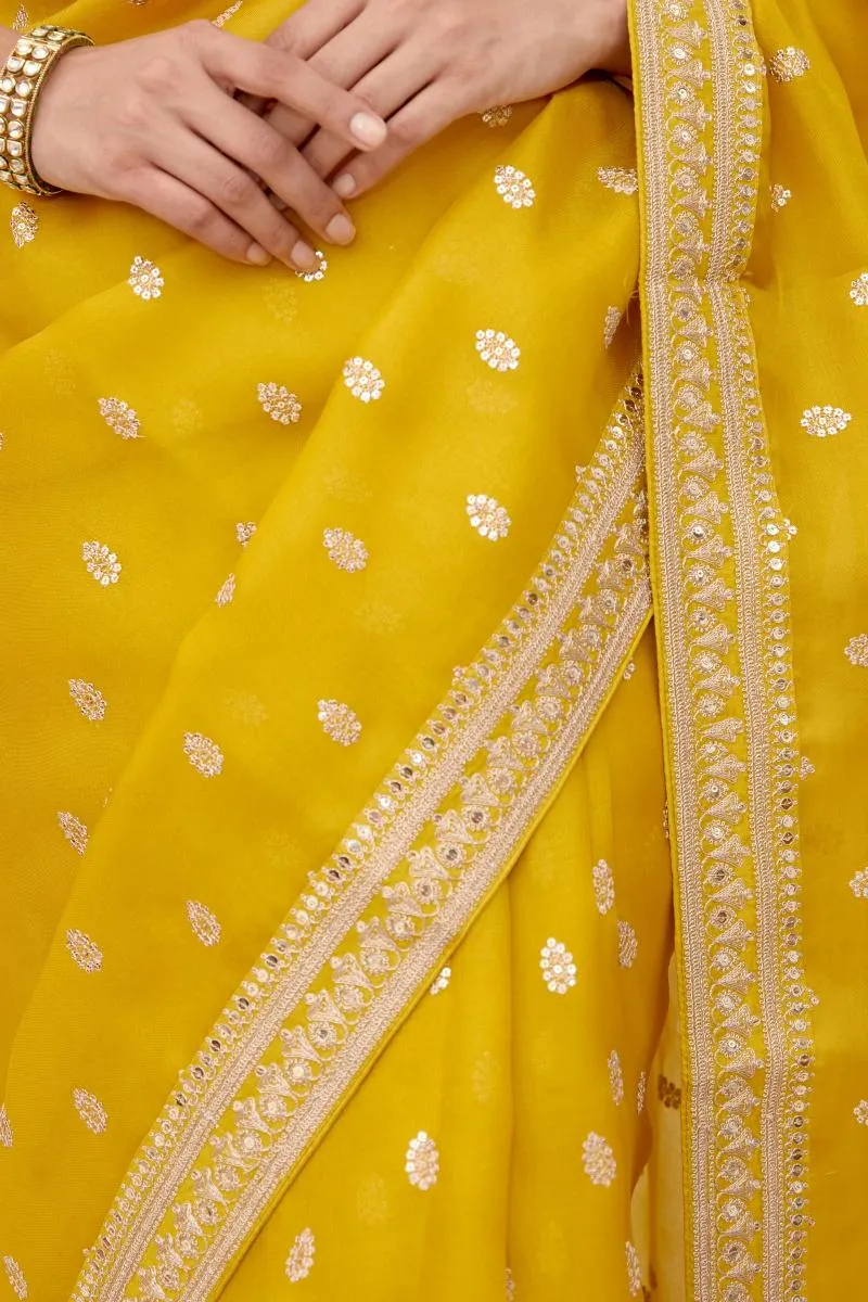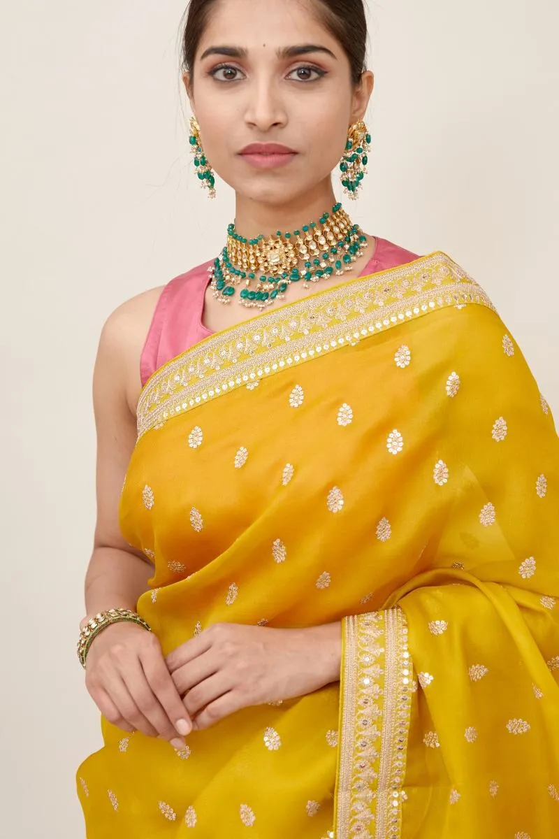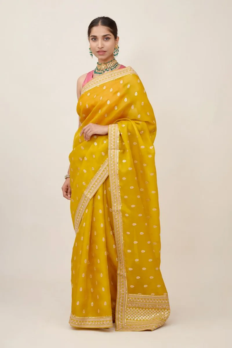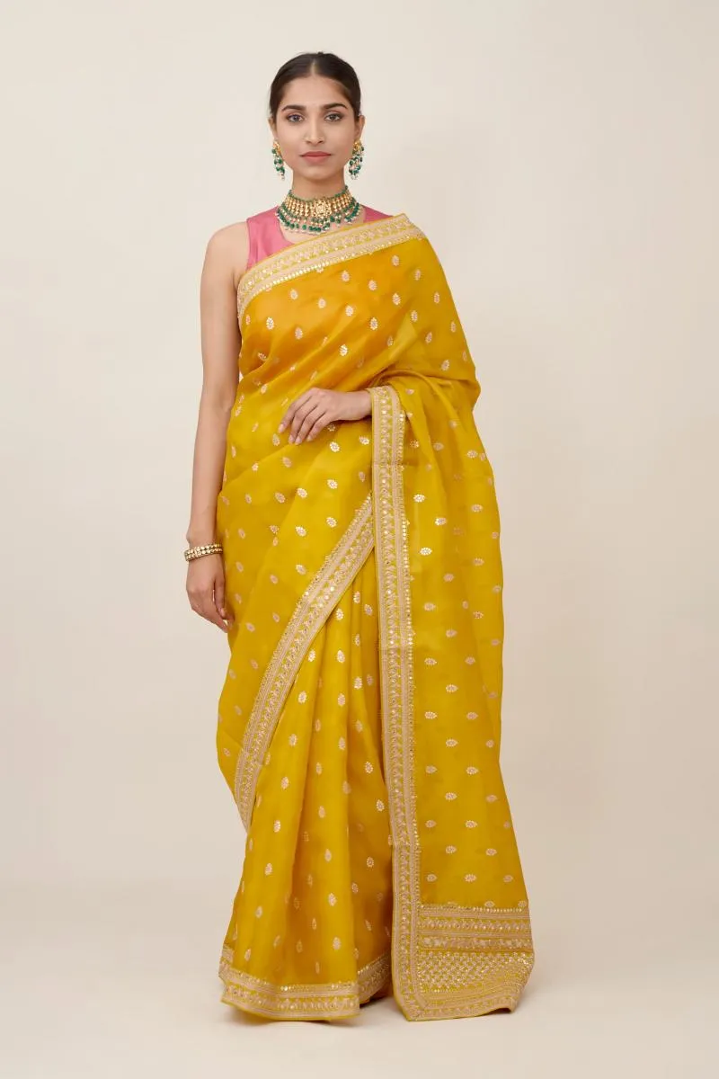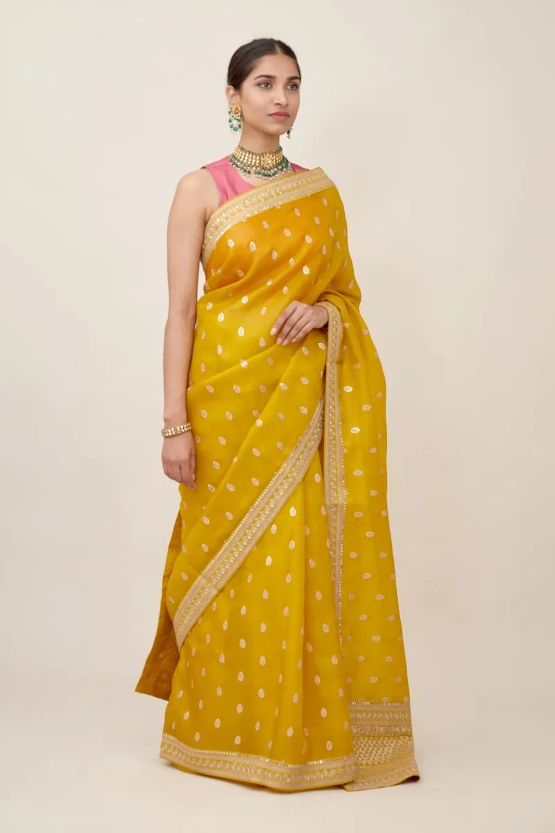 Work: floral butti on all over the saree embellished with zari and sequins plain blouse with sleeve border