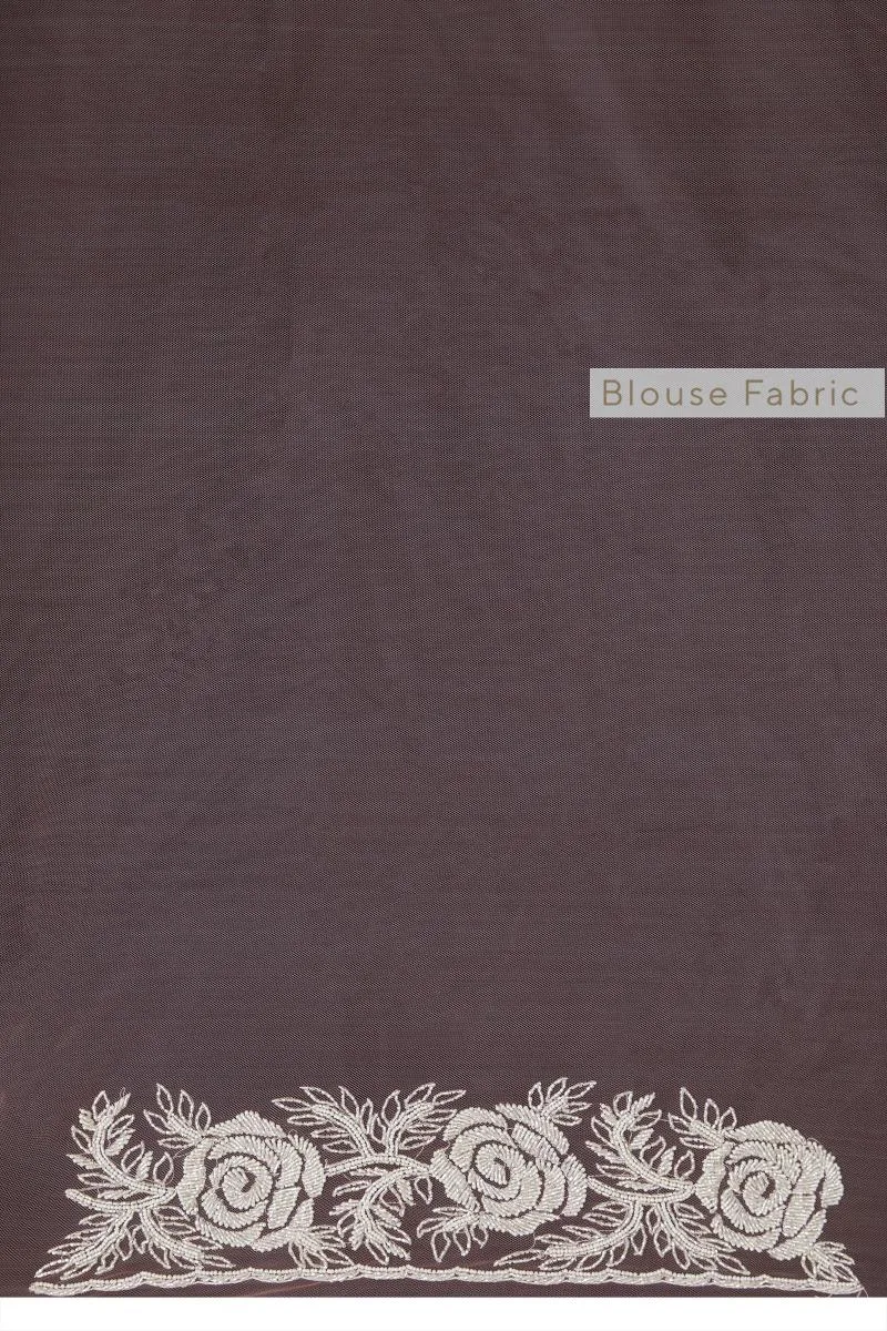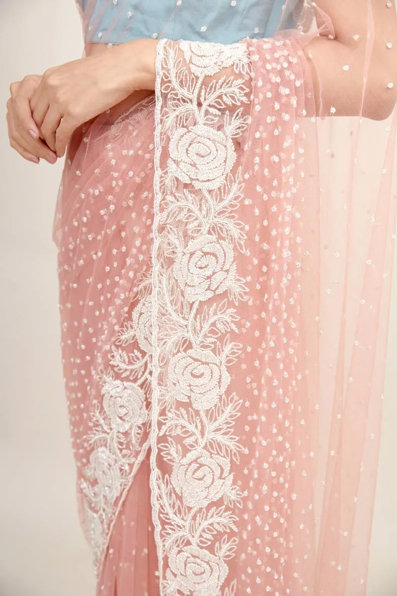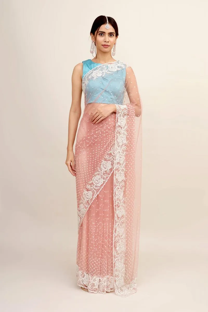 Work: net saree embroiderd with floral bail border scolloped border katdanana circles on lower part of saree and palla plain blouse with sleeves border