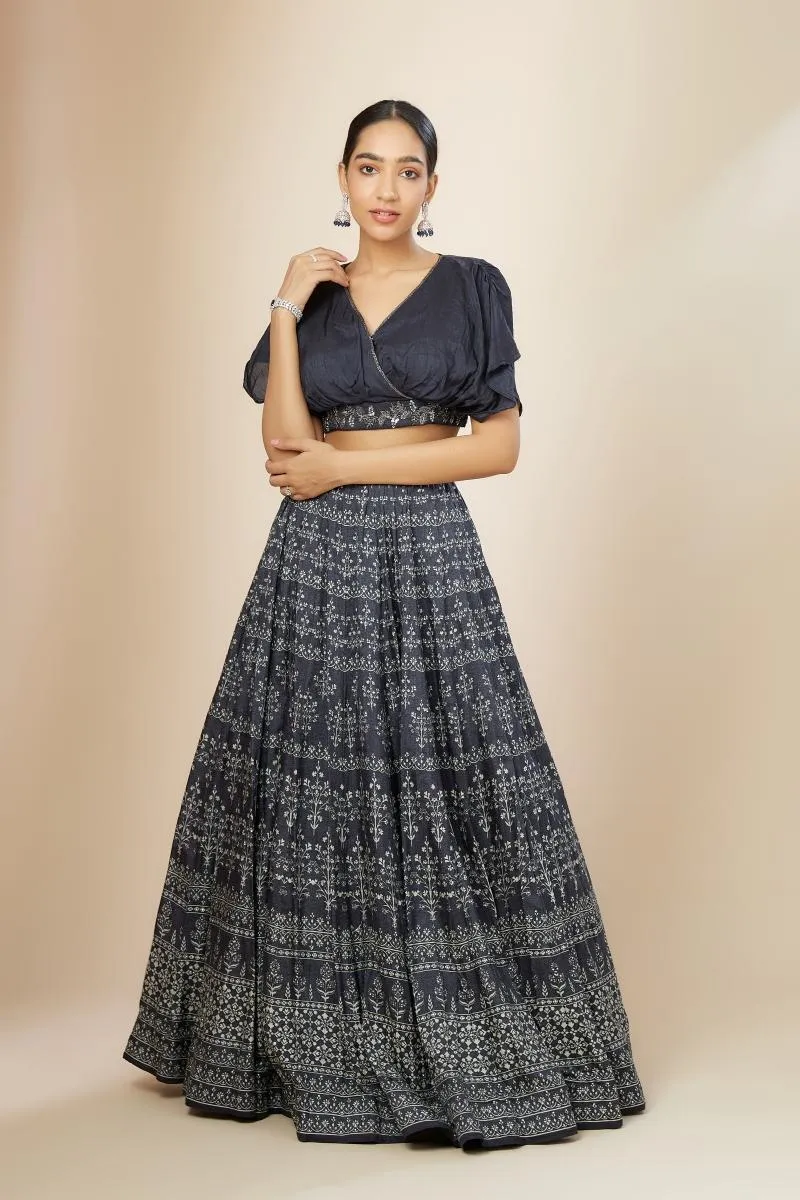 Midnight Grey Digital Printed Raw Silk Lehenga Set
