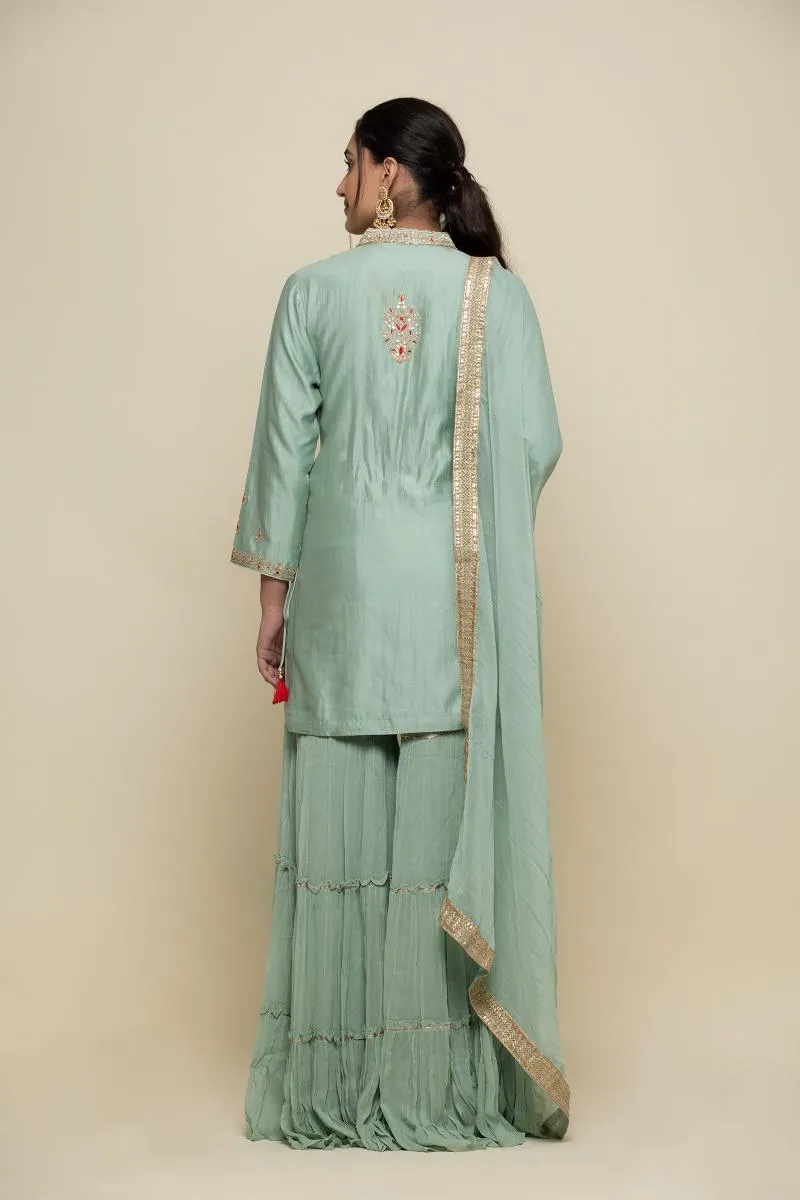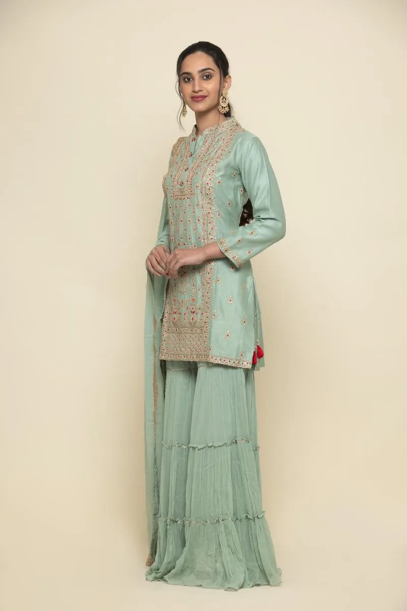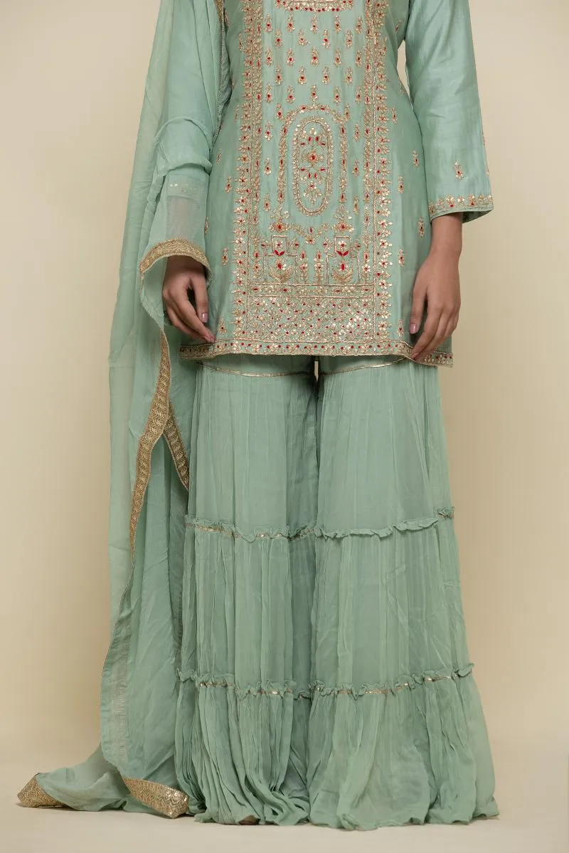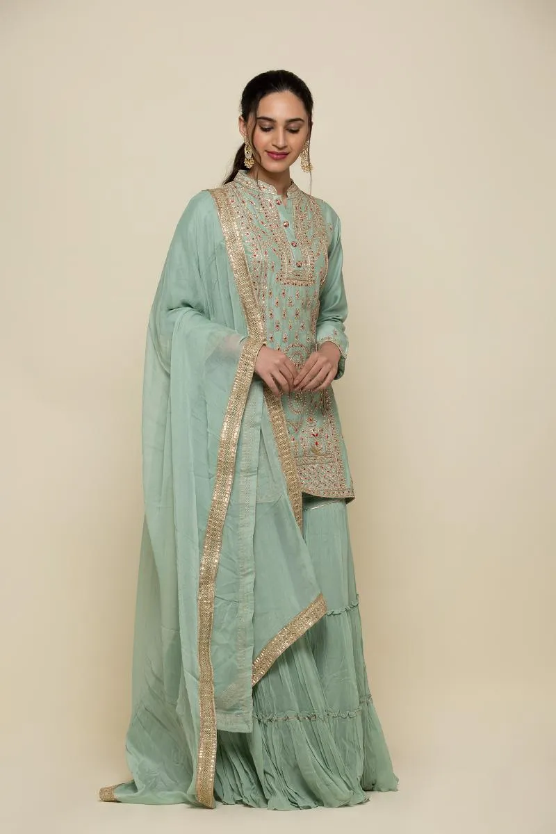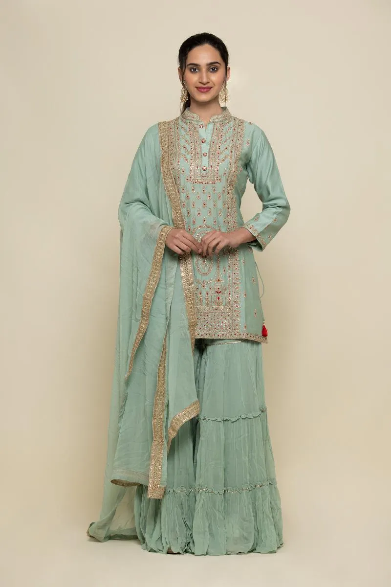 Professional dry-cleaning only. The garment should be kept in Soft Muslin fabric. Do not spray perfume directly on garment. Avoid mothball use. Kindly keep the garment in moderate climate as same of the embroidery material tends to react with the weather change.