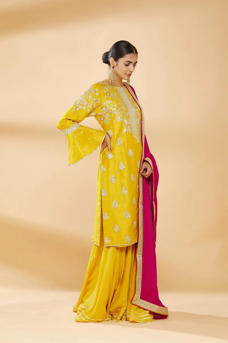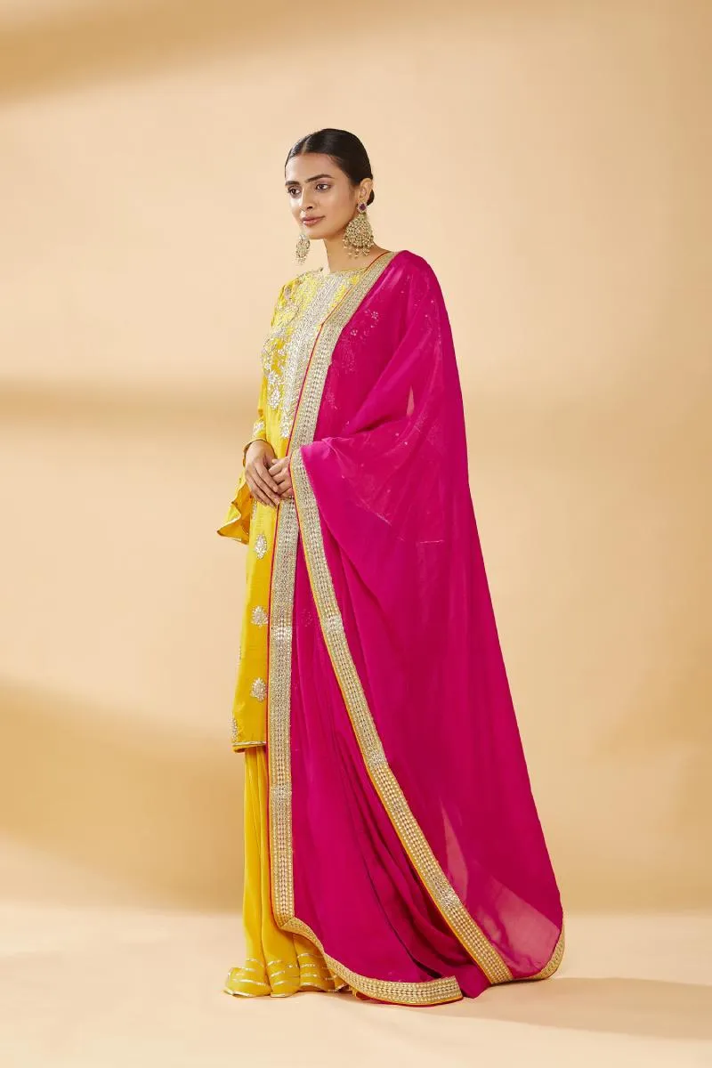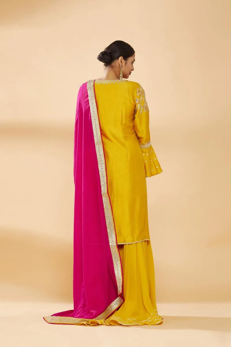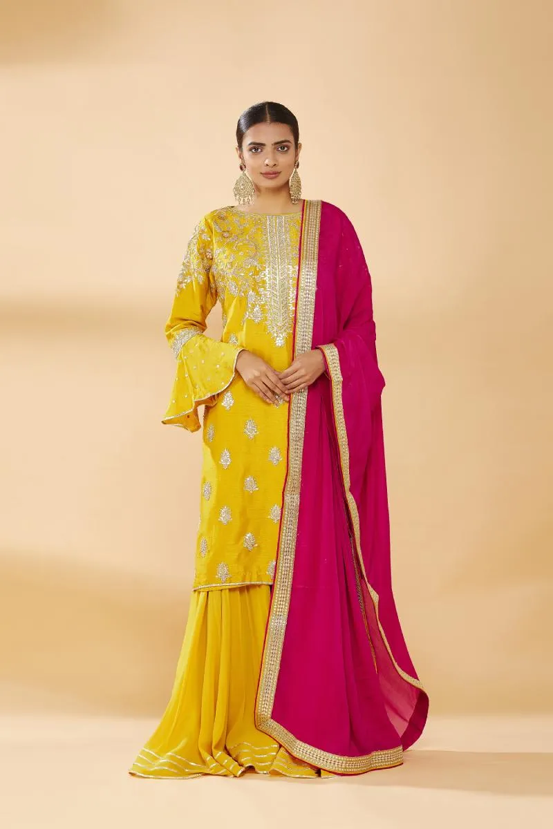 Mustard Embroidered Sharara Suit with Magenta Dupatta