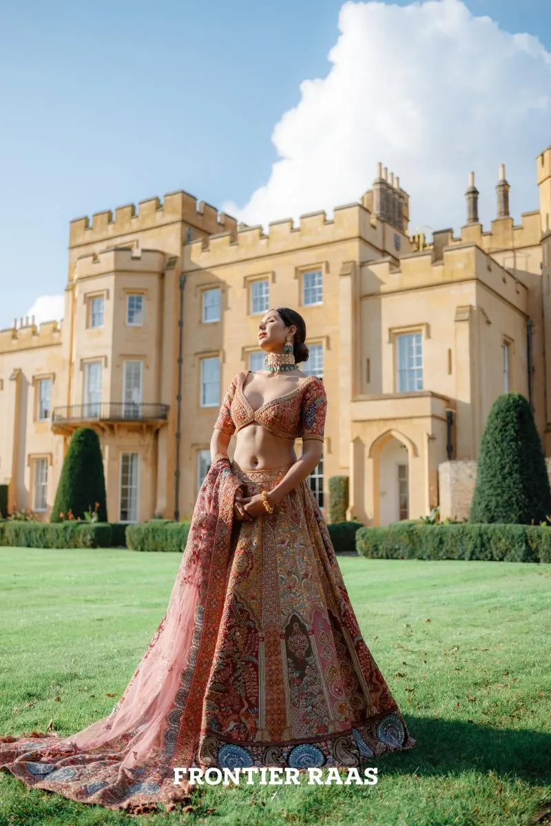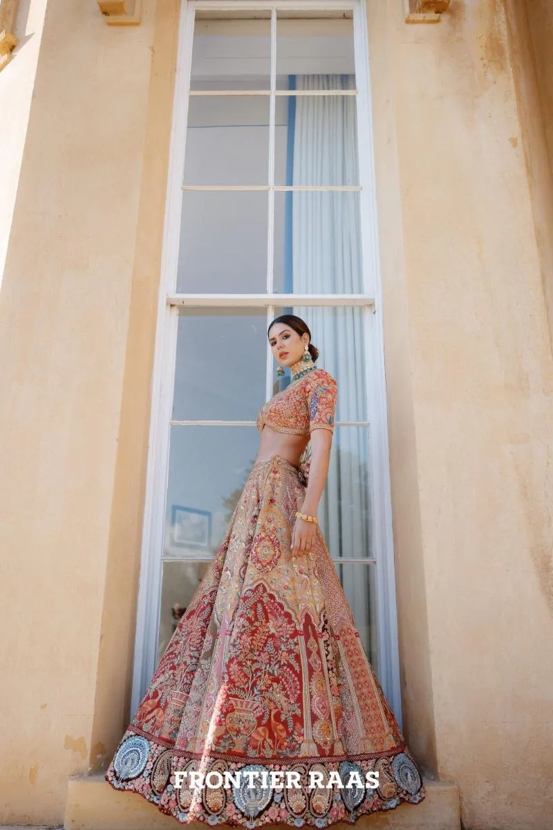 Bask in the blissful yellow, whilst you splurge in our maximalist lehenga , a relic of the past crafted on Fine Raw silk tapestry. An elaborate rendezvous of traditional mughal motifs. The lehenga is a window to heritage gardens and life, illustrated with defined jharokhas that bring to fore the vivid flora and fauna in glimmering sequin, statement dabka work and multicolour resham work embedded on contrasting appliqués. The flare is sumptuously outlined with precision cutwork where the majestic peacocks dance in a paisley symphony. Paired with a blouse flaunting a plunging neckline, embossed thoroughly. The elaborate lehenga comes with a sheer net dupatta ornamented heavily with details to match and a trail of wispy tassels along the border. The lehenga comes with a statement belt to be styled about the midriff in defining cutwork and drop crystals. Our story Mustard Silk Lehenga is a unique heirloom by TARAASA that pays homage to our rich heritage and indigenous culture, while elevating the ensemble through contemporary sensibilities, transforming it into a perfect piece for the Bride of the Century.