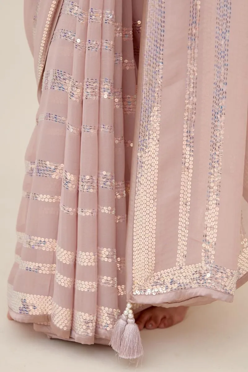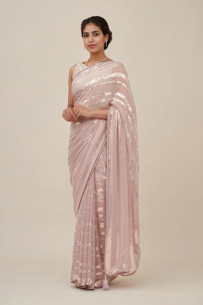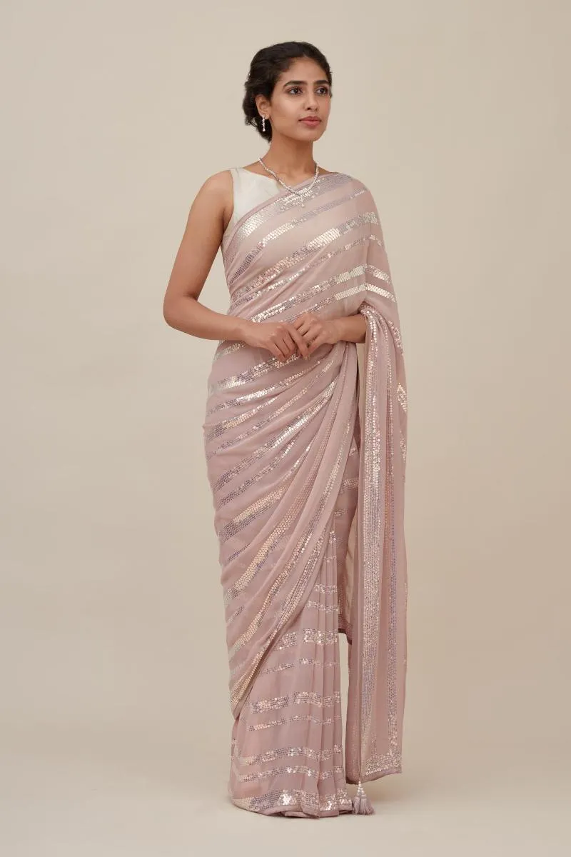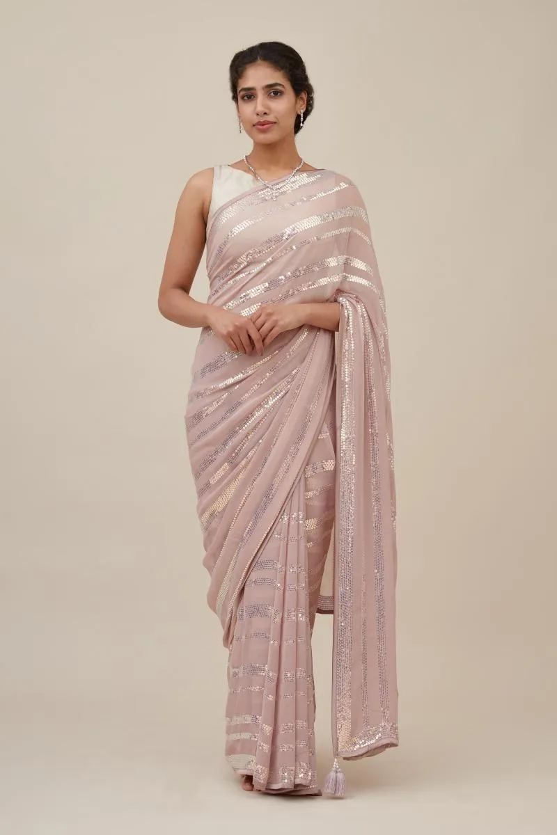 Work: sequin stripes on lower part of the saree plain blouse with sleeve border