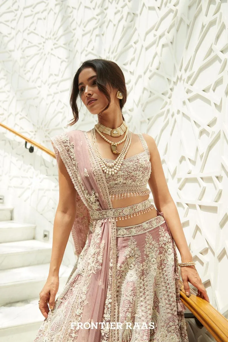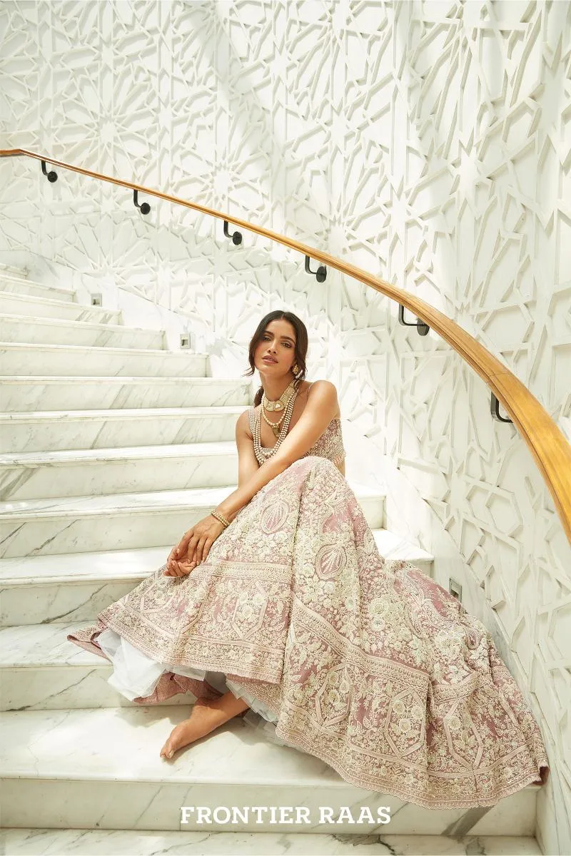 Our very contemporary old rose organza lehenga is Tarassa’s muse. That brings to the fore fresh cuts and options for a bride to be. Don this piece of exclusive bridal couture for a day time wedding ceremony, or on a frolicking cocktail night with friends and family.
