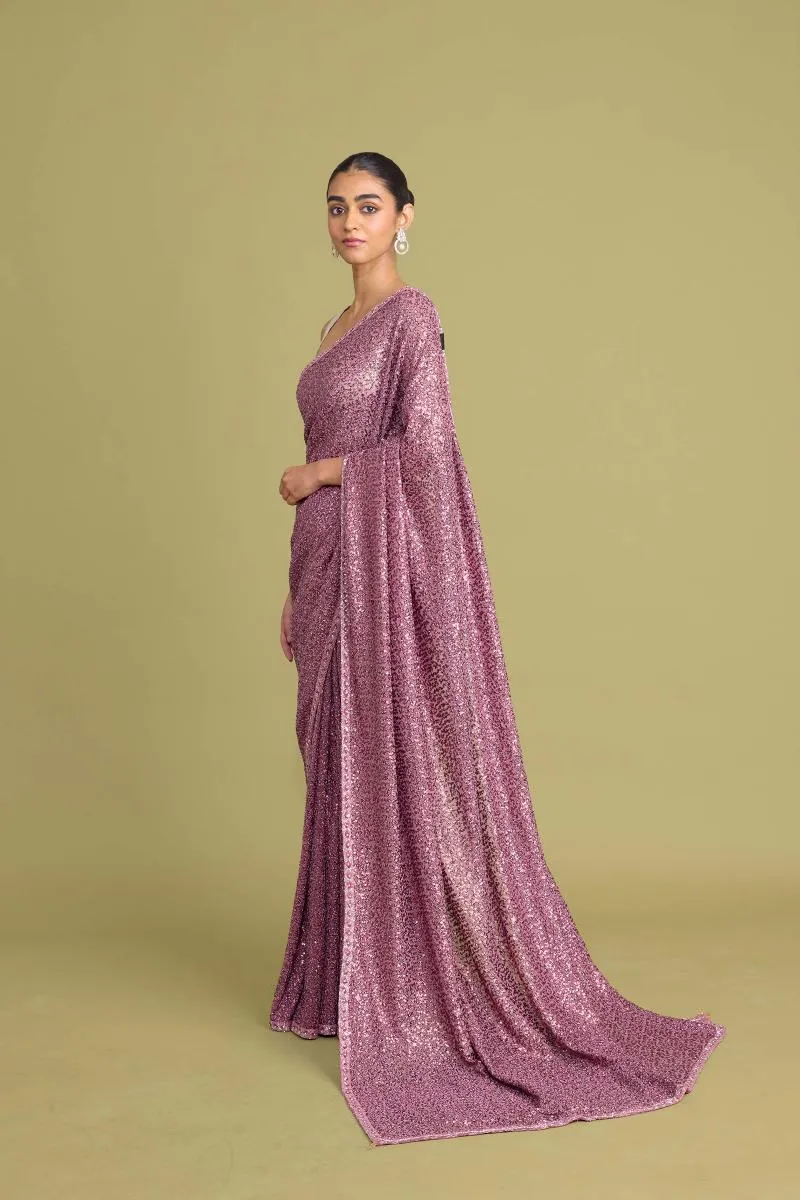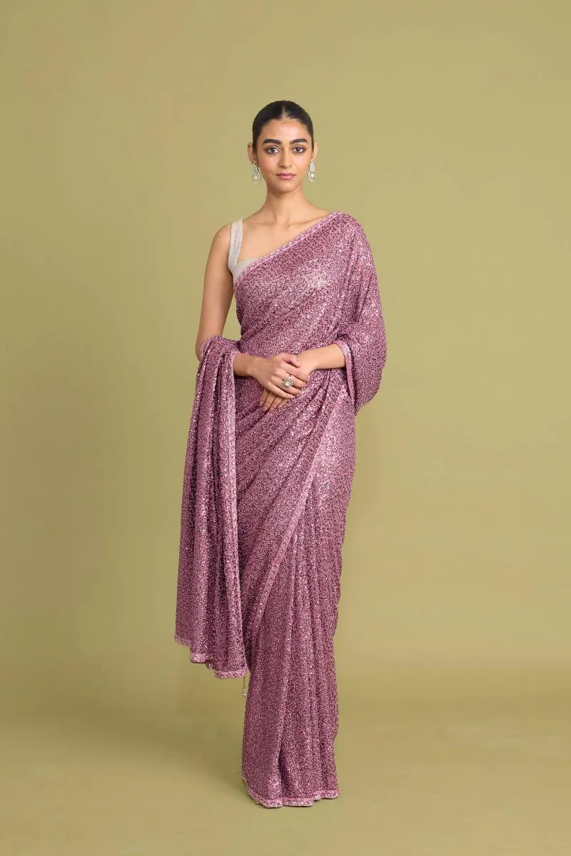 Soft and delicate, the Onion Pink net saree is a vision of grace. Embellished lightly with sequins and cutdana, it feels weightless on the body and flows with ease. Best suited for pastel weddings, day ceremonies, or post-wedding get-togethers.
