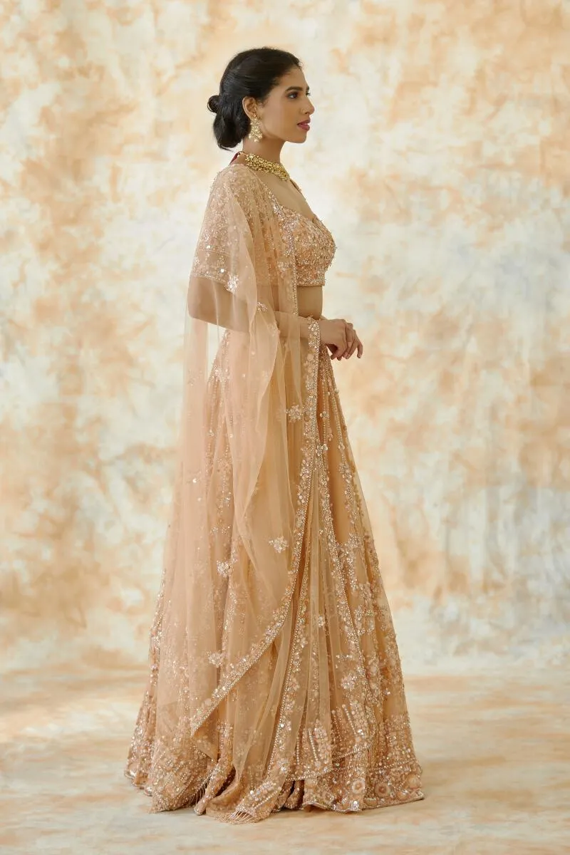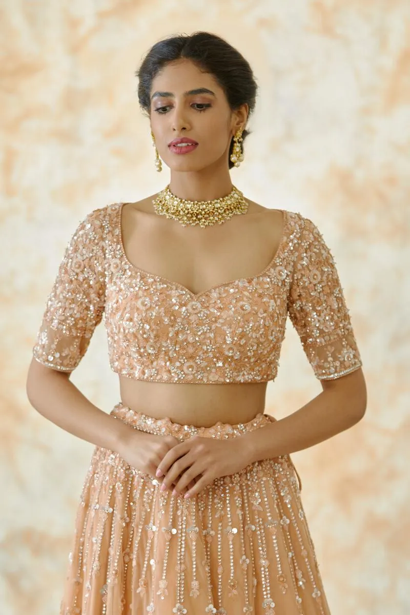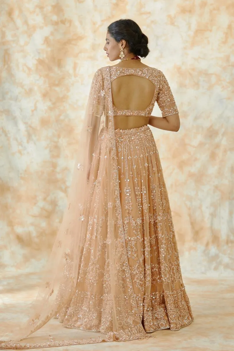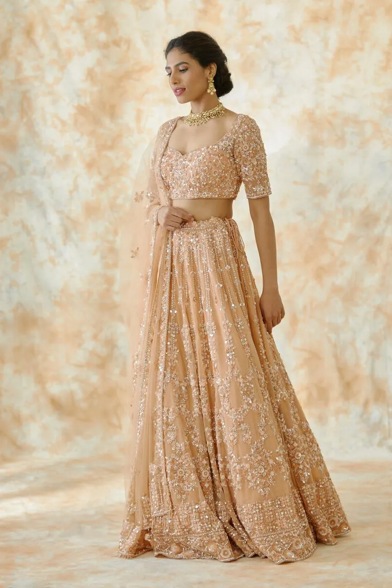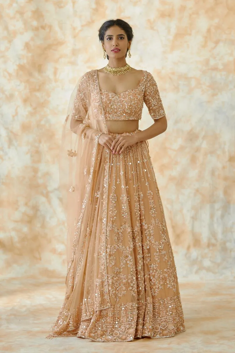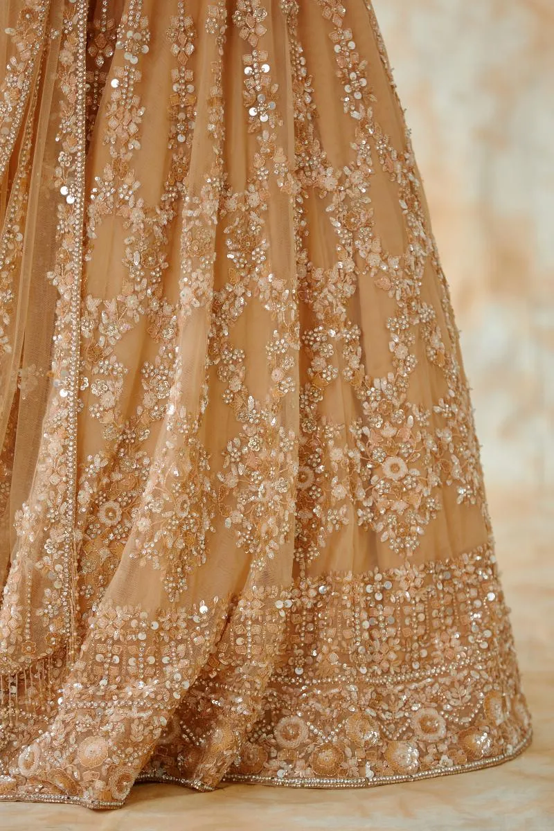 Work: Peach attair fabricated on net, blouse surfaced with different types sequin, cutdana and zarkan work in floral jaal, paired with tonal lehenga set with similar emb. In floral grid formation, coupled with tonal embroidered dupatta