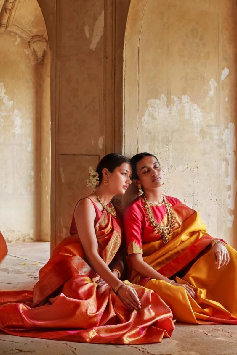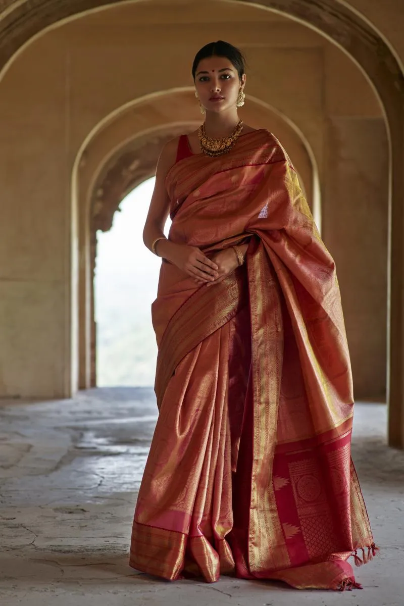Pink base Kanchipuram saree with long-established complex zari work all over with gleaming traditional border and palla in contrast color thread and zari.
