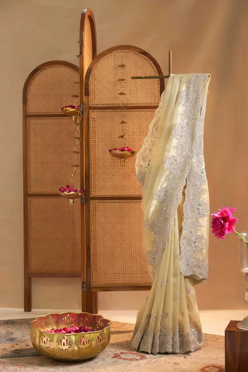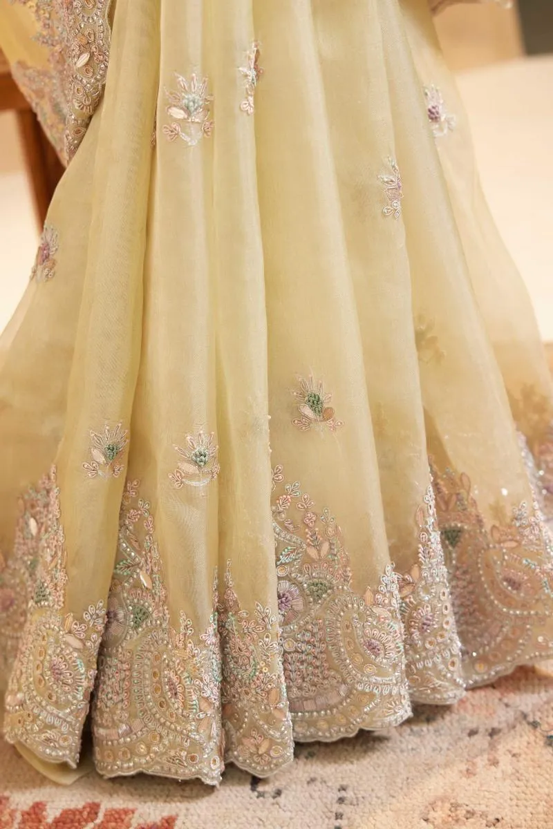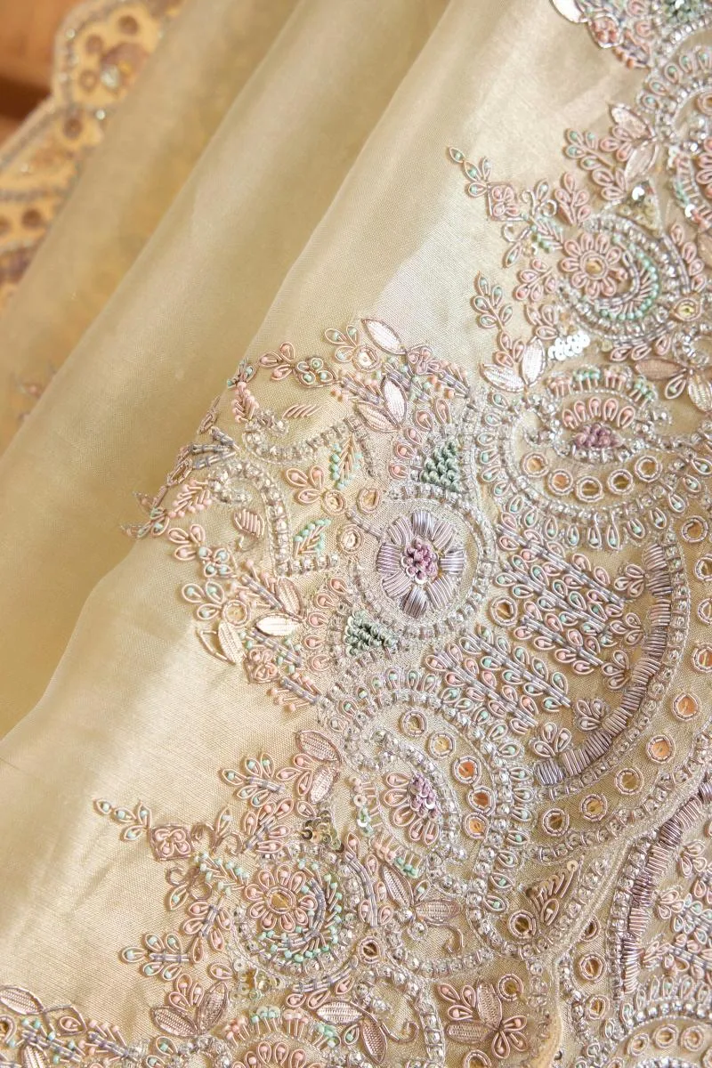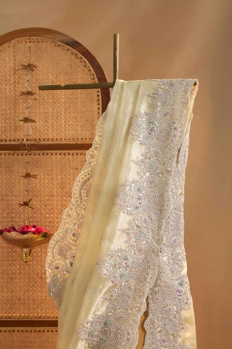 Draped in sheer elegance, our Pista Tissue Organza Saree captivates with delicate details. The saree features intricate gotta patti, French notes, and zardozi work all over. The cutwork scallop border adds a touch of sophistication. Paired with a heavy blouse this handcrafted masterpiece radiates charm. The handwork on the saree and blouse adds to its allure, making it a perfect choice for special occasions. Accessorize with heavy earrings and a sleek hairstyle to be haldi or sagan ready .
