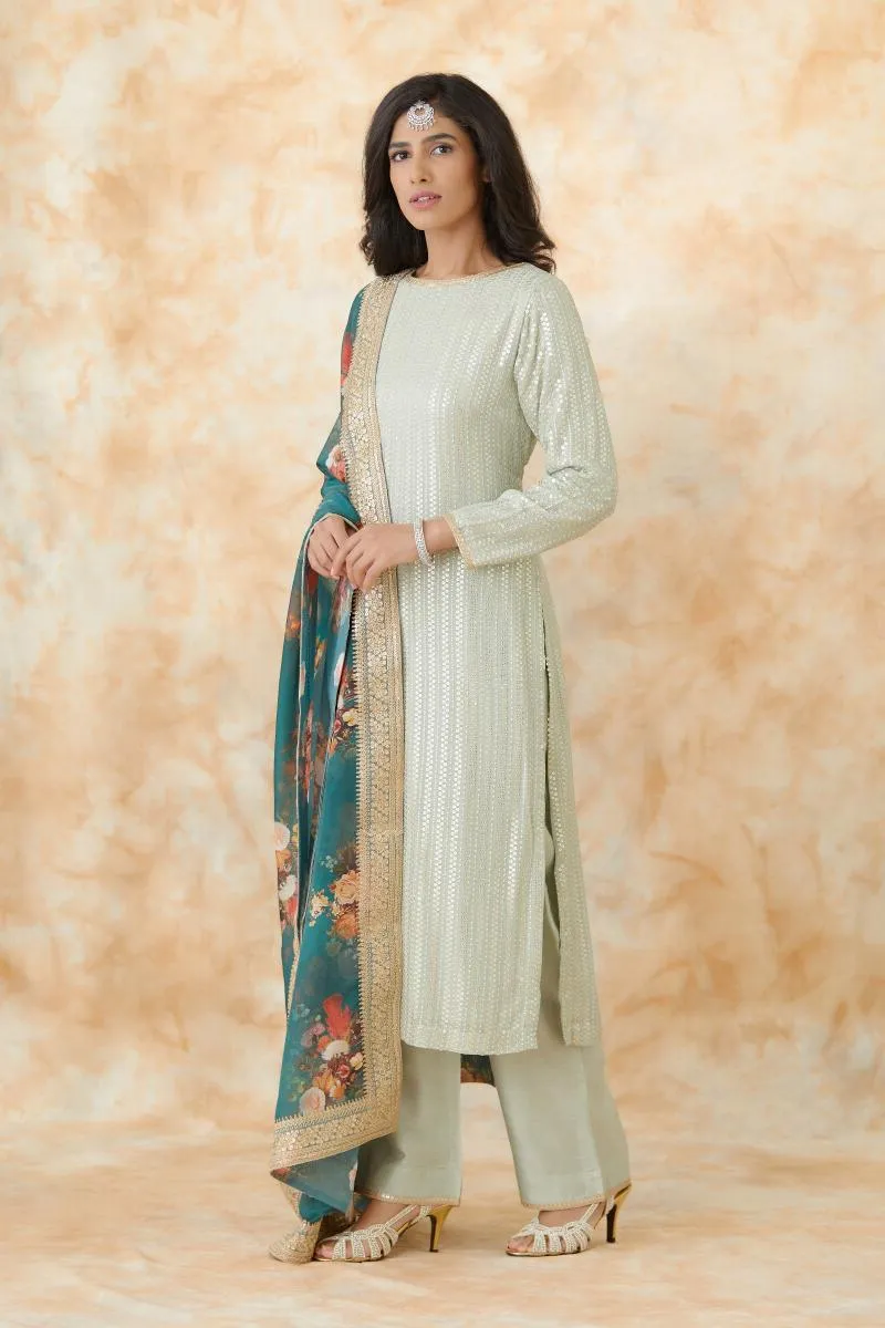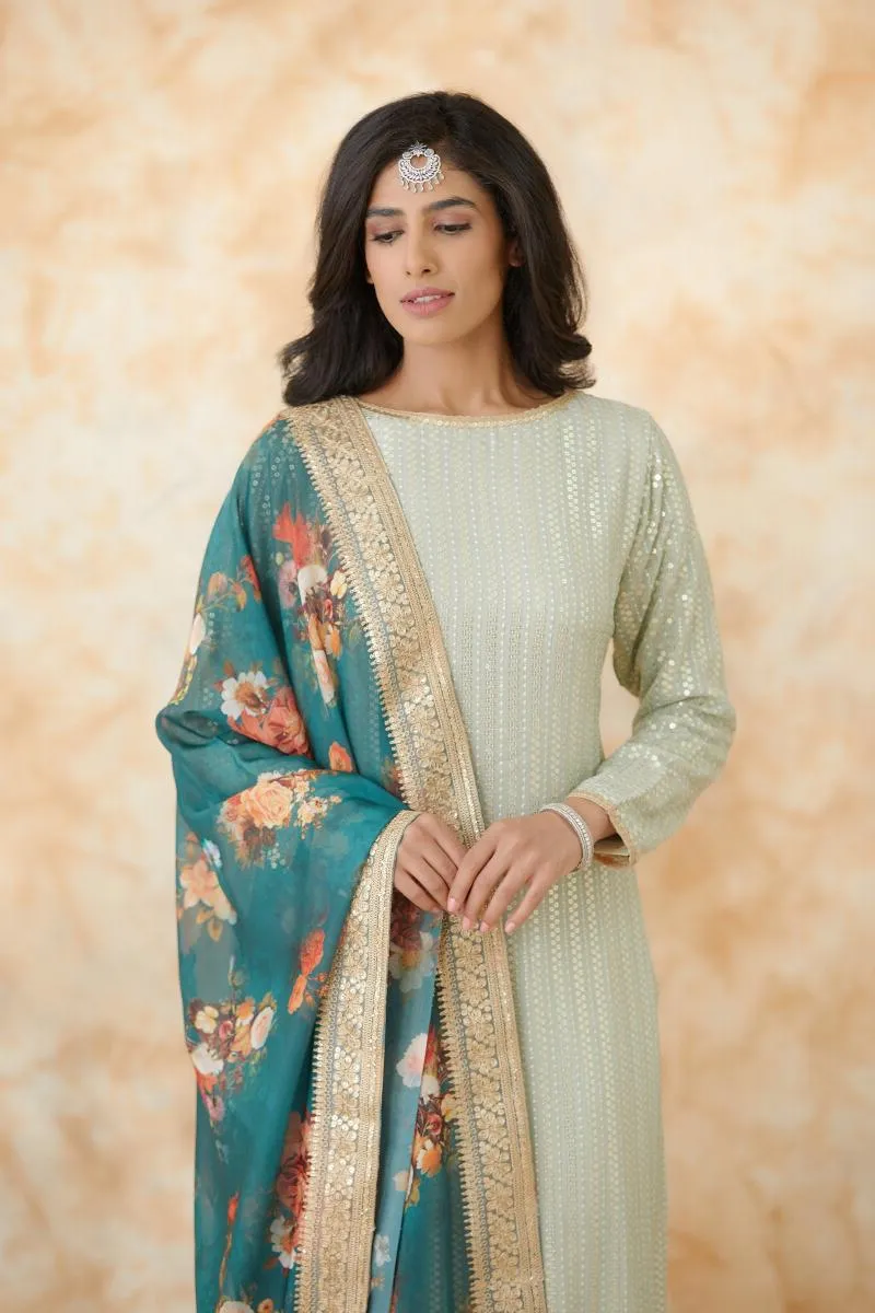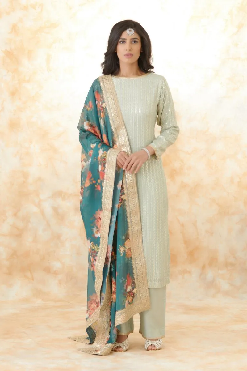 Work: sequence work on shirt organza floral printed dupatta raw silk plazo sequence lines on shirt rama green dupatta