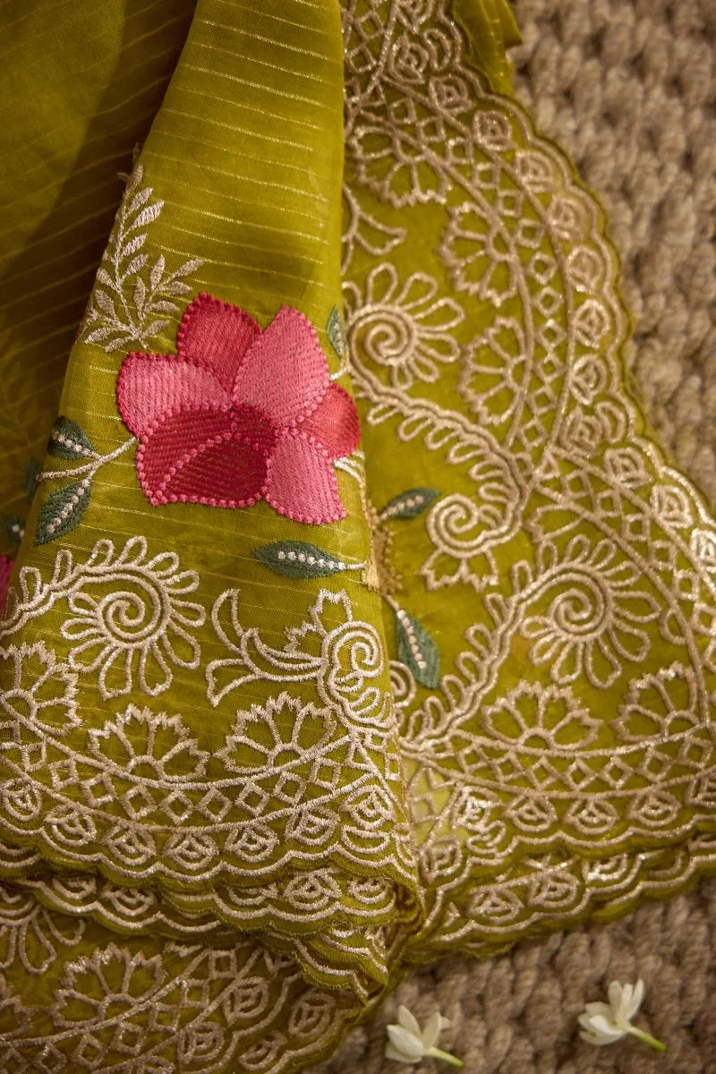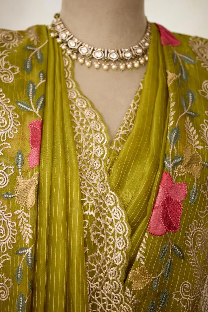 Professional dry-cleaning only. The garment should be kept in Soft Muslin fabric. Do not spray perfume directly on garment. Avoid mothball use. Kindly keep the garment in moderate climate as same of the embroidery material tends to react with the weather change.