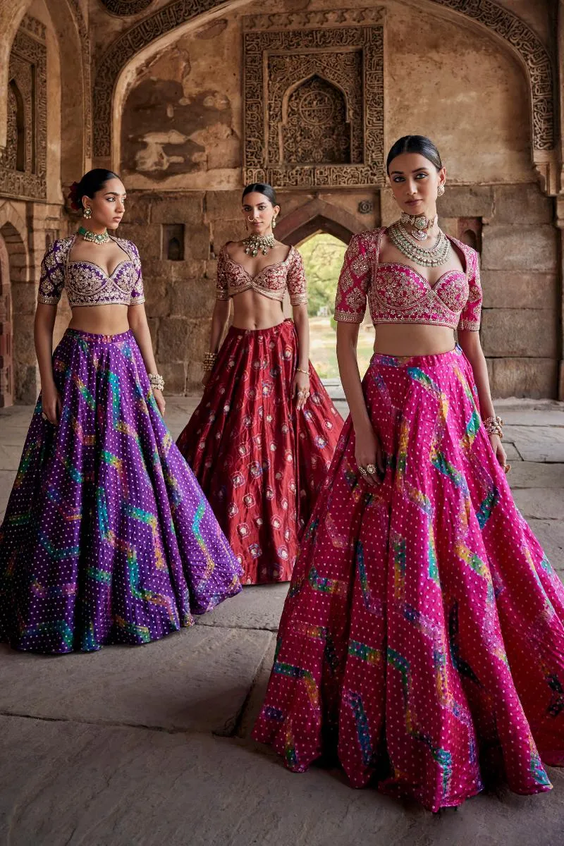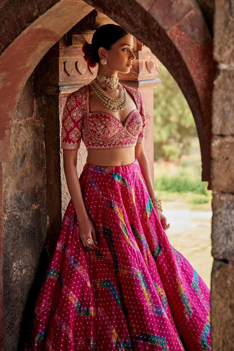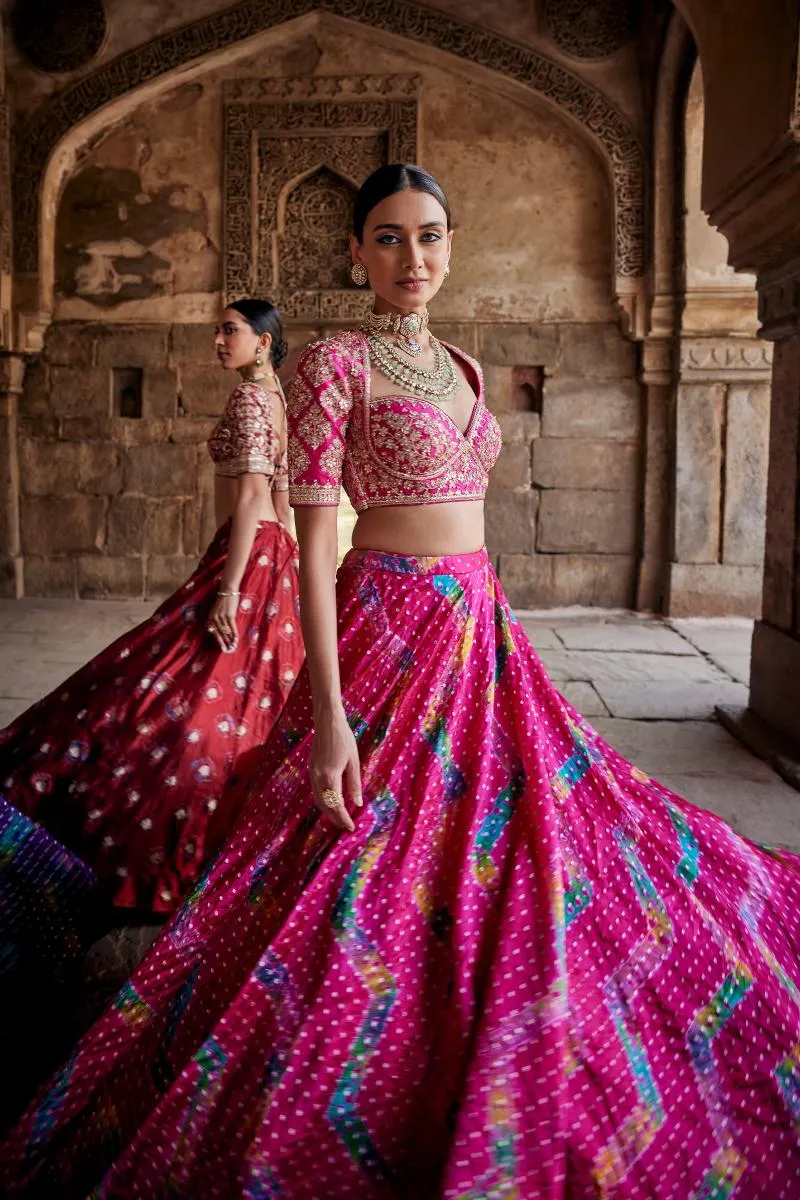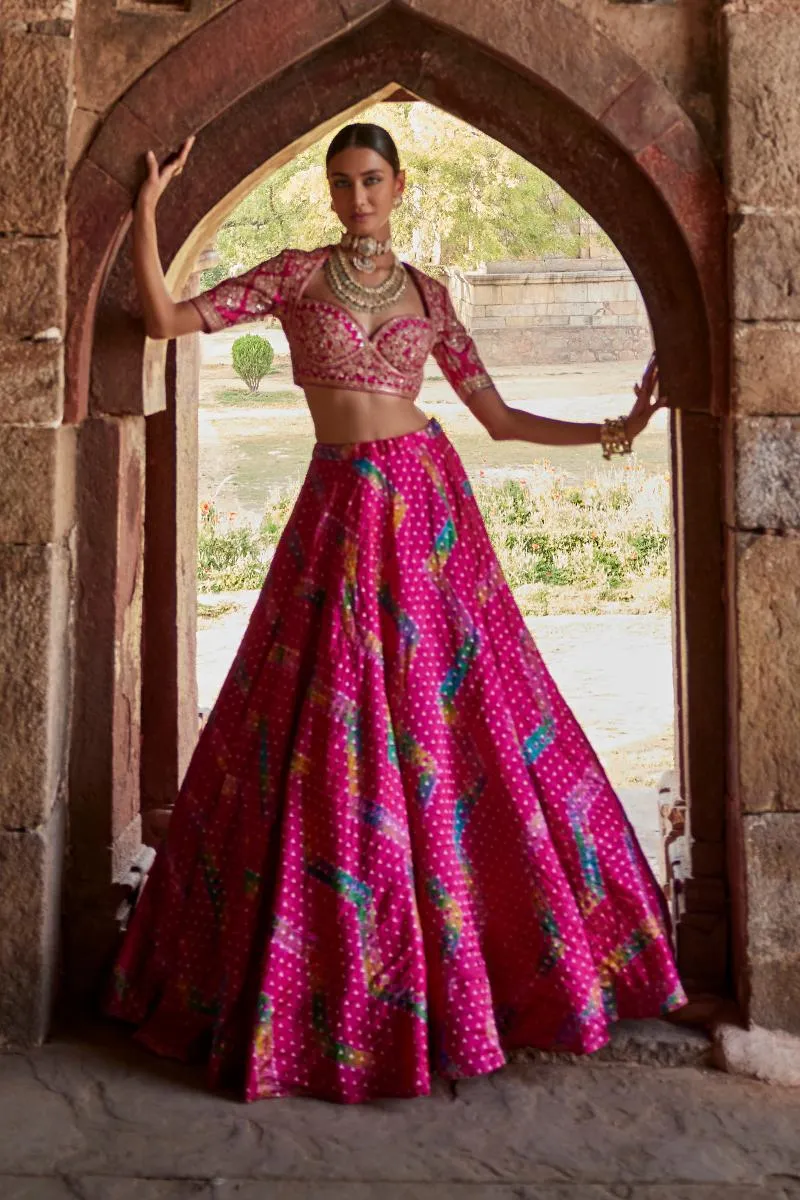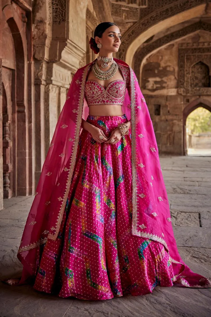 Immerse yourself in royal sophistication with our Rani Pink Silk Bandhani Lehenga, showcasing a captivating tie-dye pattern and a voluminous billowing flare. The sweetheart plunging neckline is adorned with exquisite and elaborate embellishments of dori and gotta work, intricately adorning the blouse and exuding opulence at every glance. Revel in the timeless allure of floral jaal embroidery gracefully enhancing this ensemble. Paired with an ethereal Organza Dupatta, adorned with scattered booties and a complementary border, this ensemble embodies a perfect balance of charm and grace.