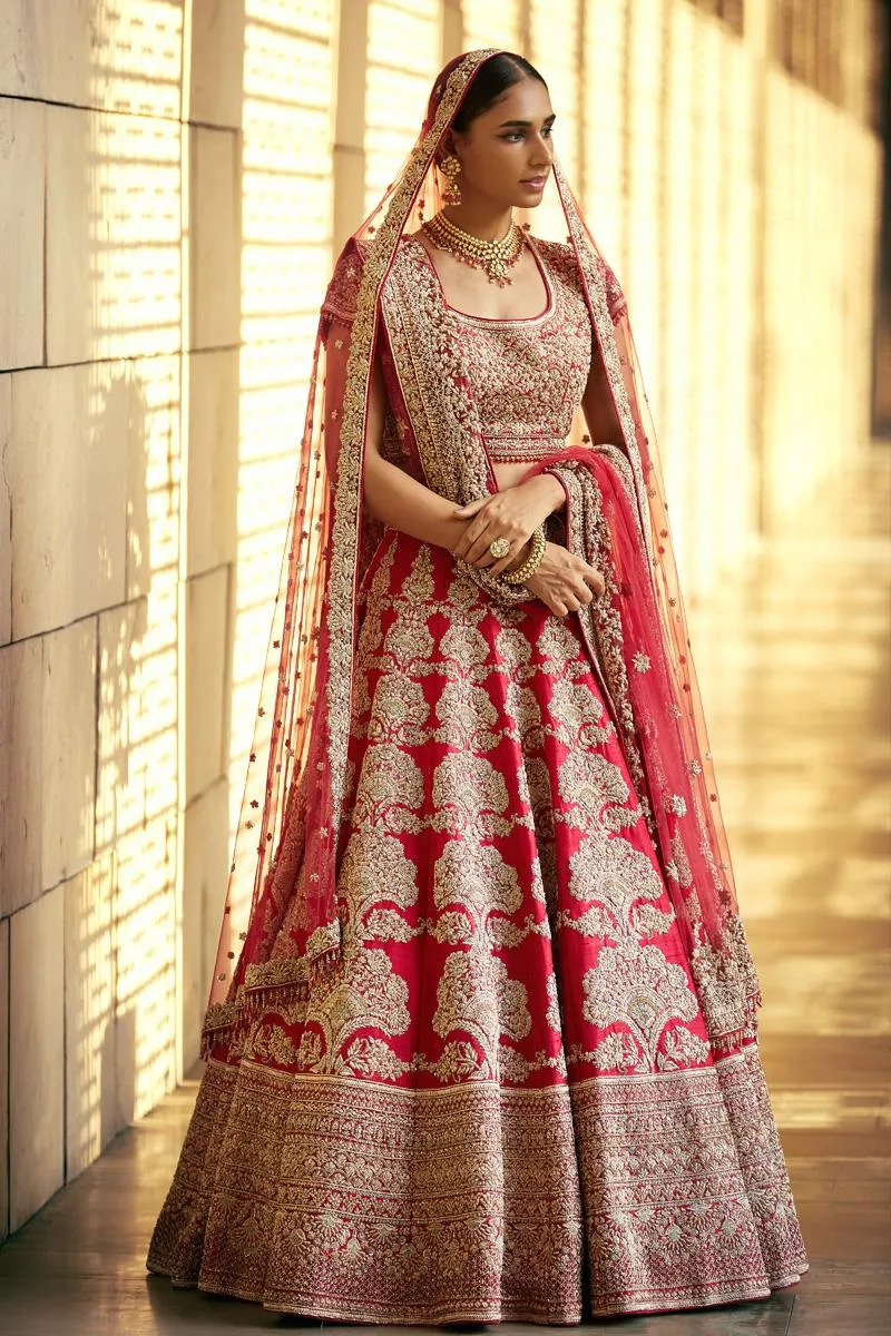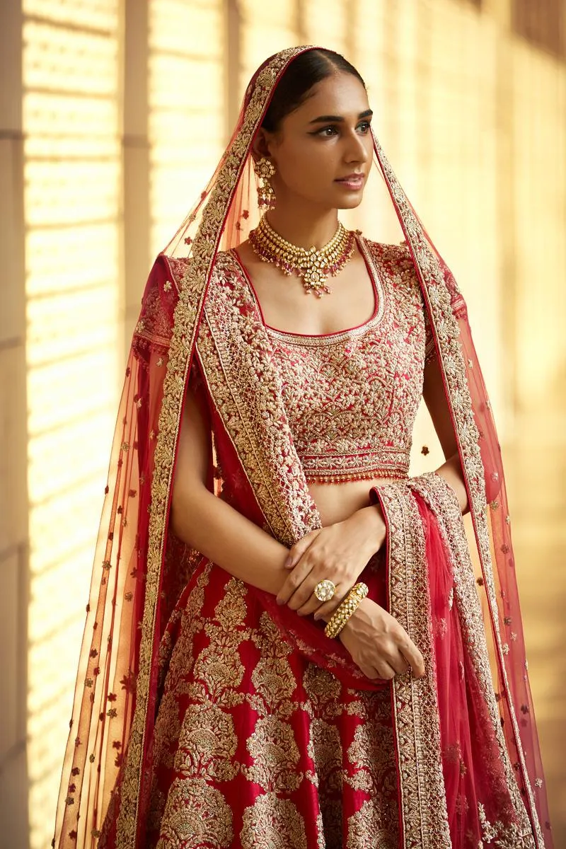Red raw silk princess cut blouse embroidered in dense jaal work done with dabka, nakshi and sequence work, waistline highlighted with crystal tassels. Paired with red raw silk kalidar lehenga foregrounded with nature-inspired floral motifs and heavy border. Coupled with net butti embroidered dupatta.