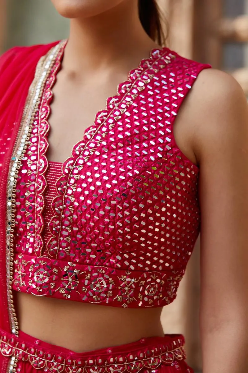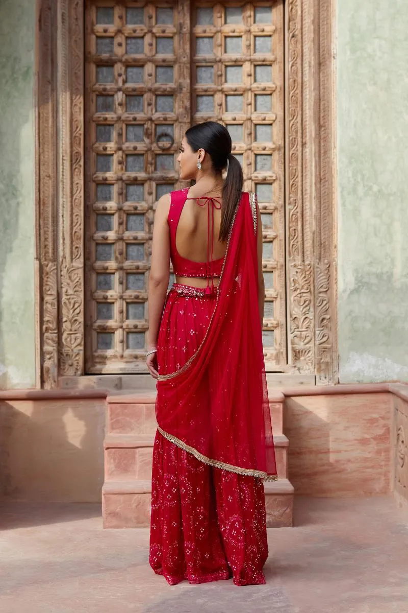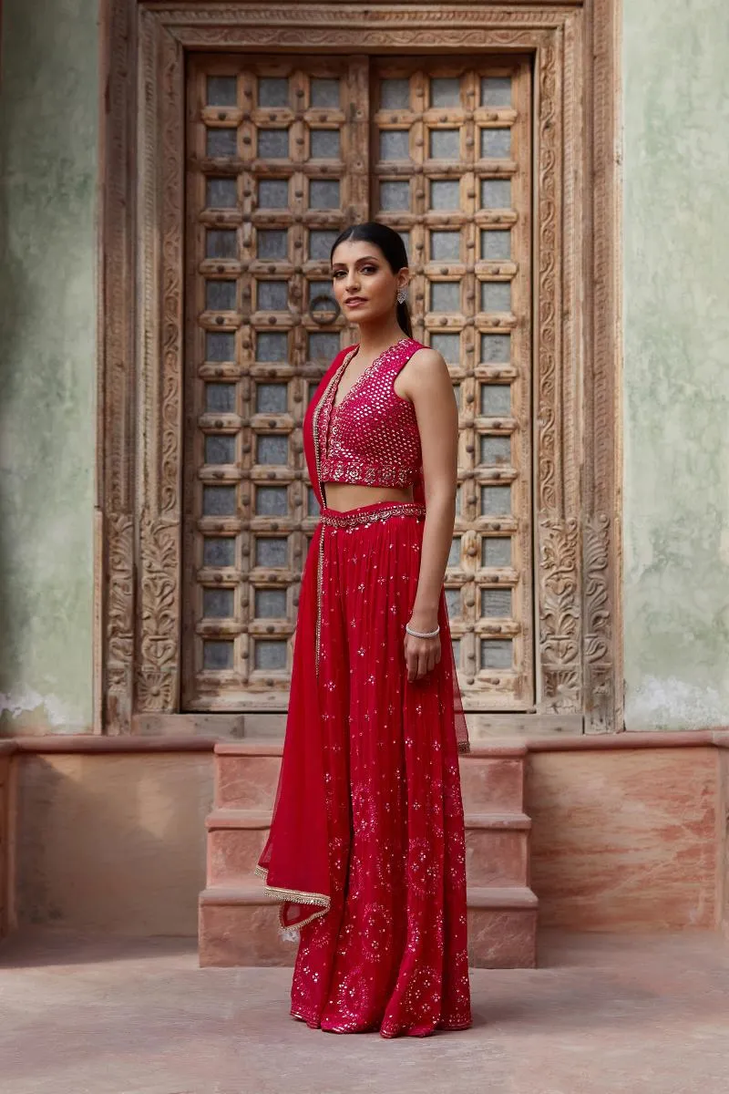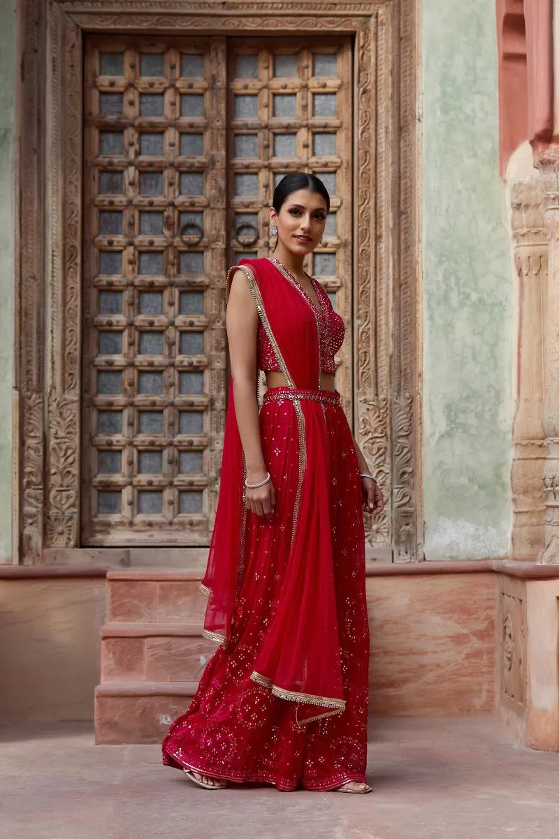 This inviting red goergette sharara is one of a kind. Mirror embedded blouse that glistens through the red hues. Hypnotic concentric geometric designs on the flared bottoms and scalloping details on the neck captivates like no other. A mirror embedded belt to taper the look and an enticing red net drape with gold gotta kingri details adds to the magic. Perfect for an intimate engagement gathering.