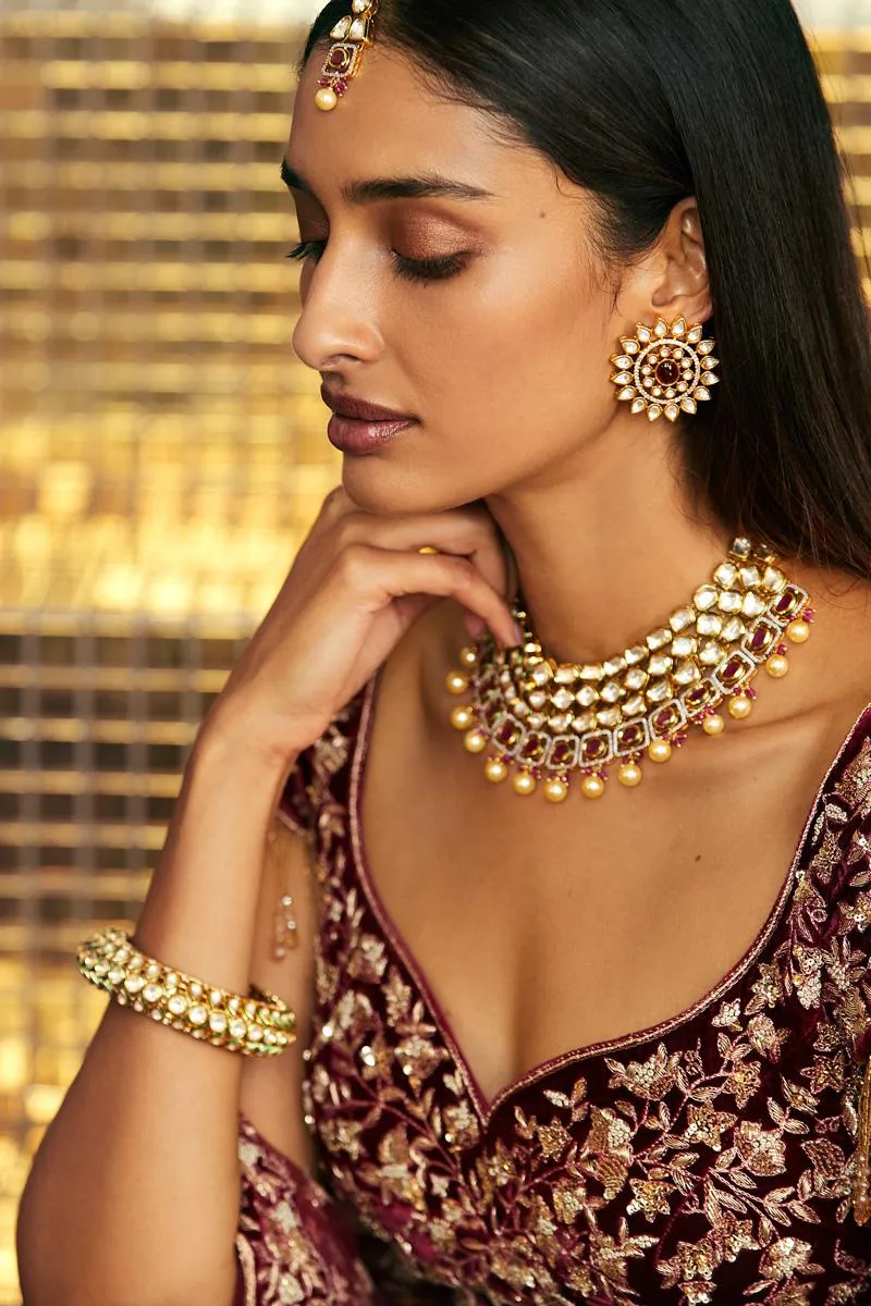 Maroon velvet sweetheart neck princess cut blouse embroidered in floral motifs and jaal, done with Dabka, nakshi, sequence and dori work, sleeves and waistline highlighted with crystal and cutdana and heavy tassels. Paired with maroon velvet double-layered kalidaar lehenga with structural design and peacocks. Coupled with heavy border and butties maroon net dupatta.