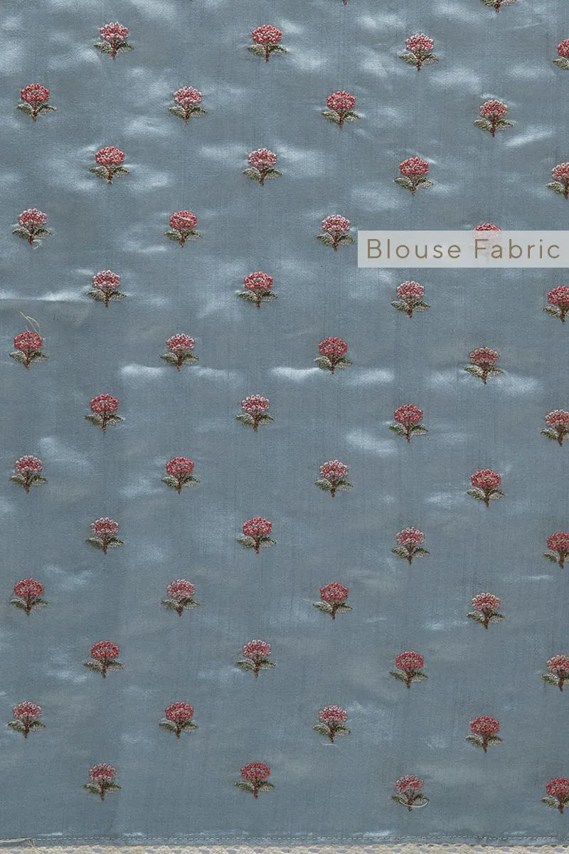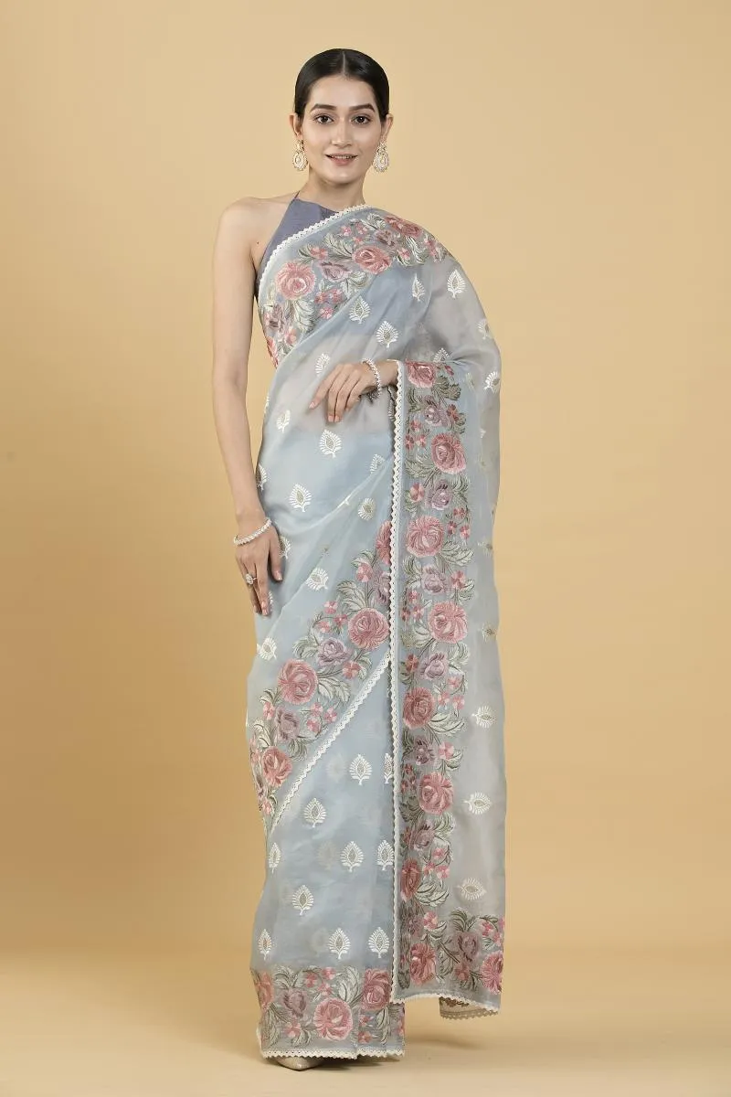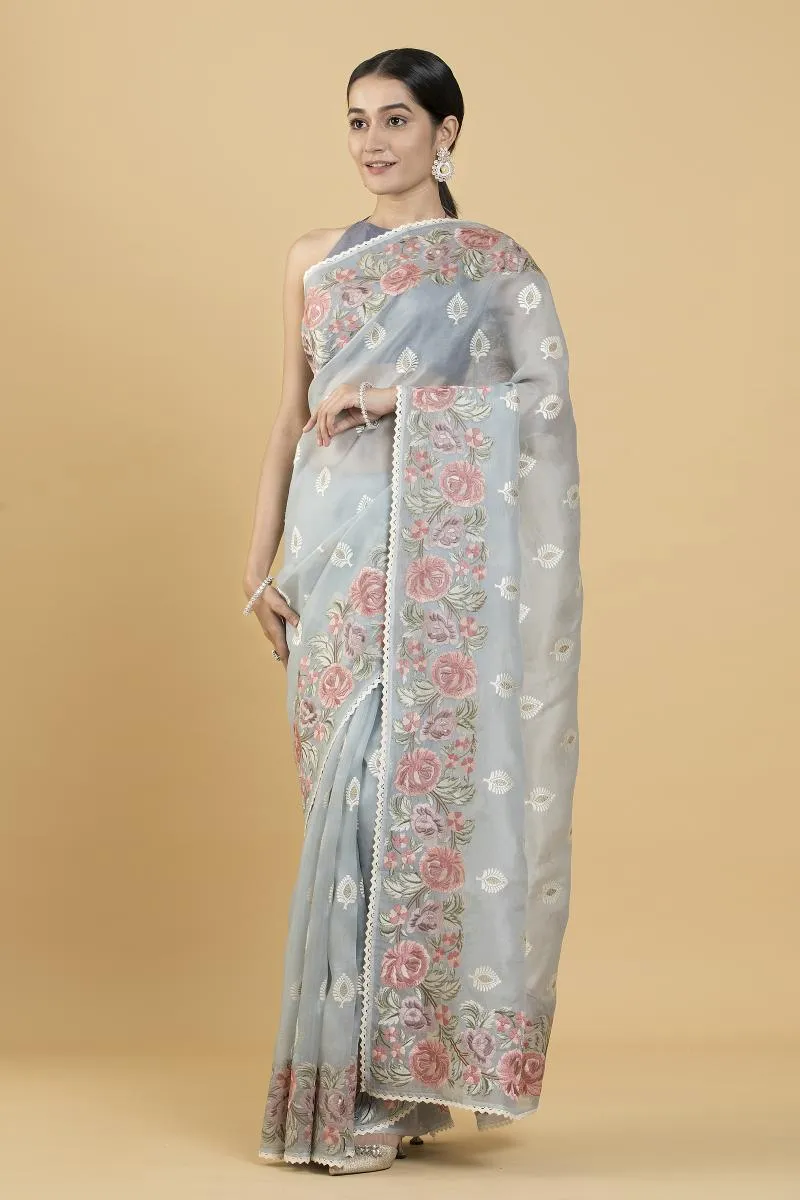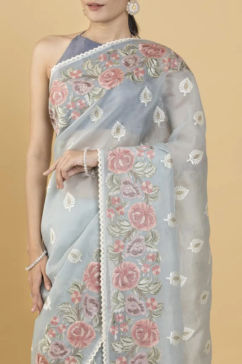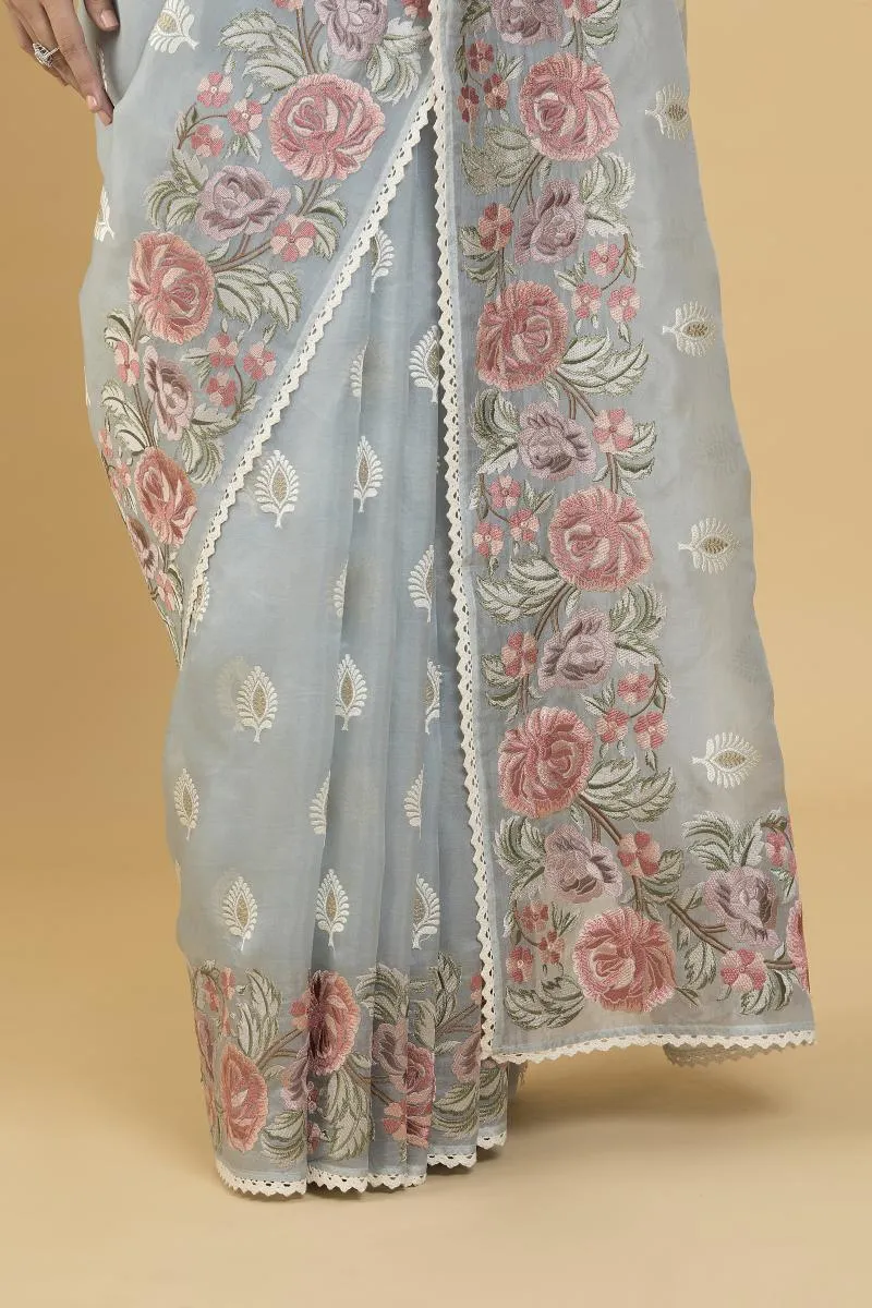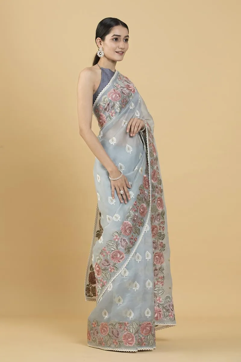 Rose and Paisley Motif Blue Organza Chikankari Saree