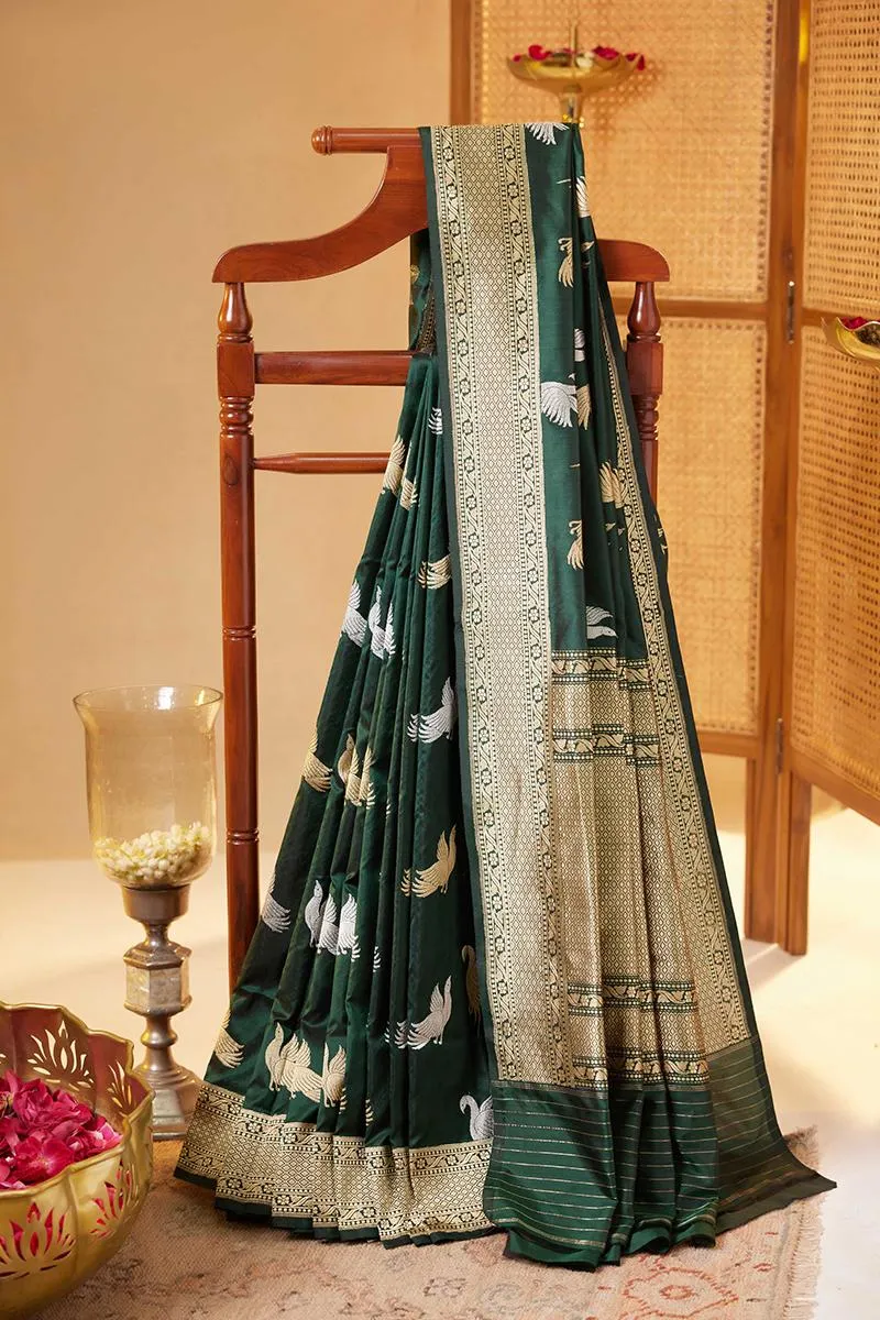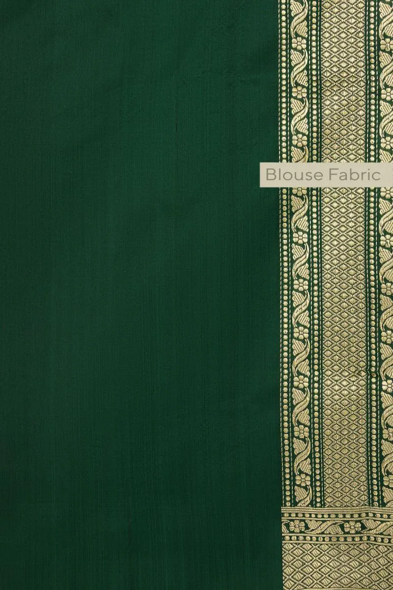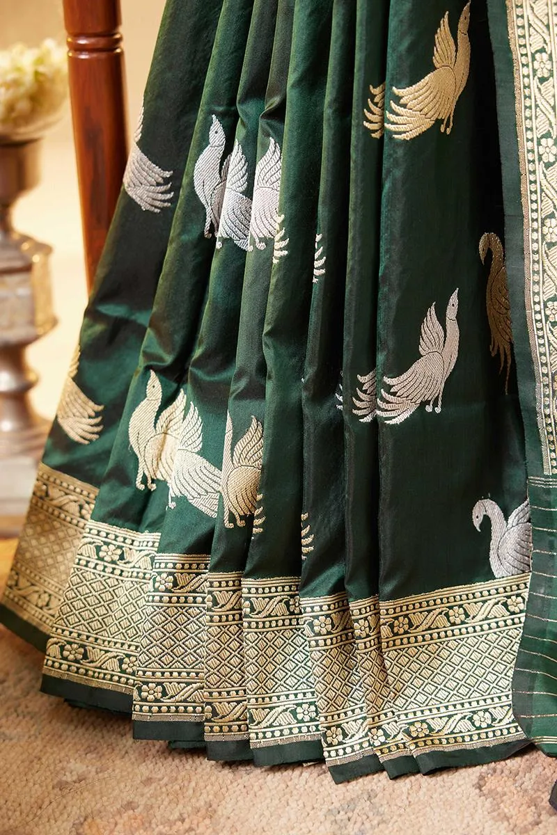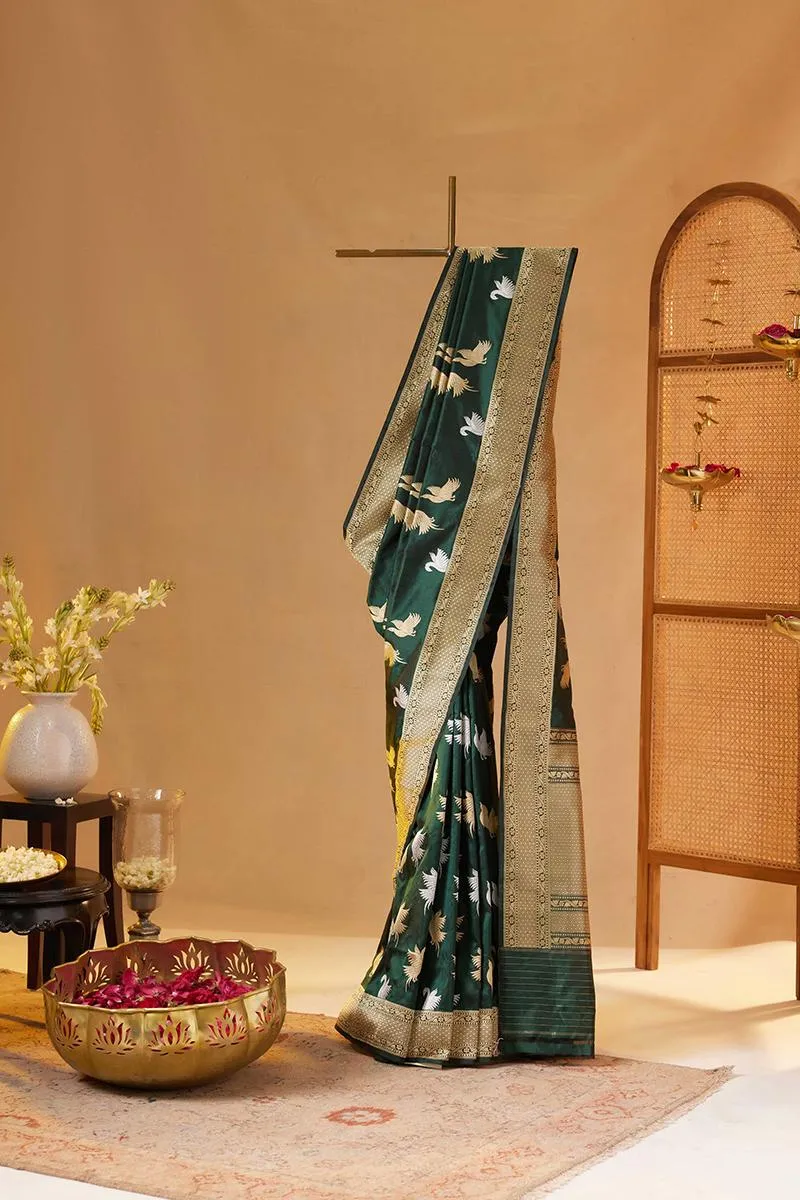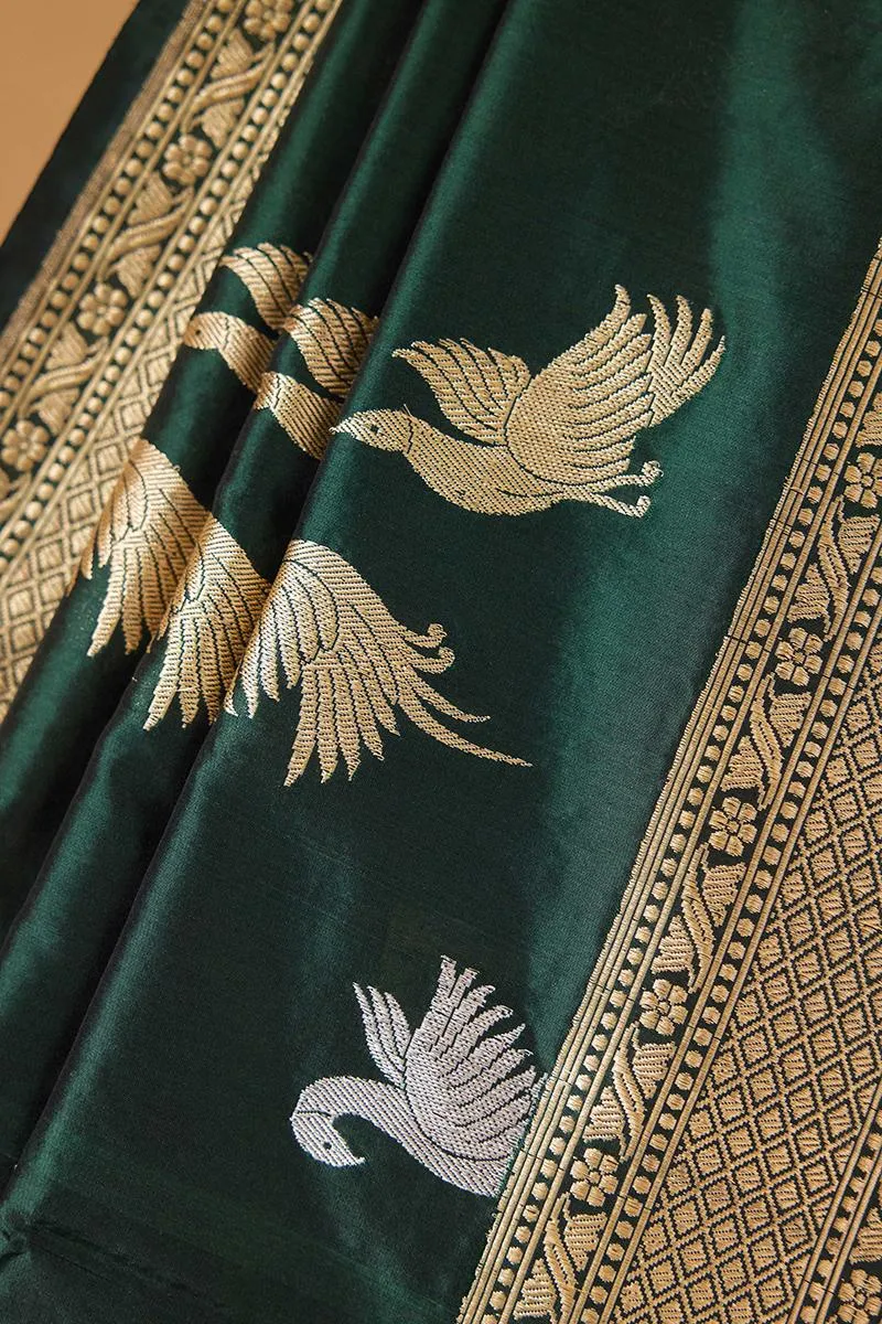 Indulge in timeless elegance without exquisite Banarsi Kattan Silk Saree in Sacramento green. Handcrafted with intricate gold jari weave with bird design motifs all over, this saree exudes an aura of luxury and tradition. The charismatic jari weave adds a touch of grandeur, making it a perfect choice for occasions. The rich Sacramento green colour signifies prosperity and tranquillity, capturing the essence of grace and sophistication. The plain unstitched blouse with gold jari border effortlessly complements the saree, enhancing its beauty manifolds.