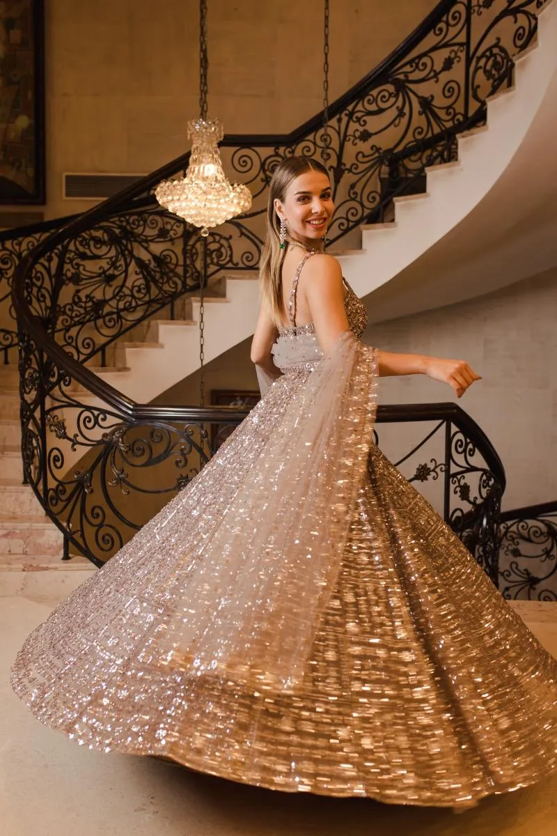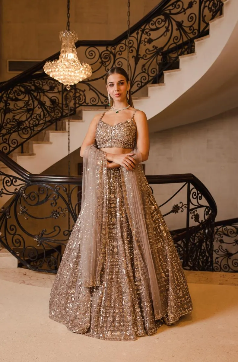 It鈥檚 a studded, glitzy affair in a heart-stopping lehenga set in the most sublime shade of Toosh. In harmony, almost dancing like the wind, a soft satin organza blouse captivates the design with aari work all over in a grid jaal. The piece de resistance, the lehenga skirt, holds still attention in an identically embroidered satin organza lehenga with geometric embroidery. The same tonal colour palette runs through the design, with a net embroidered dupatta in the same colour, to set the tone.