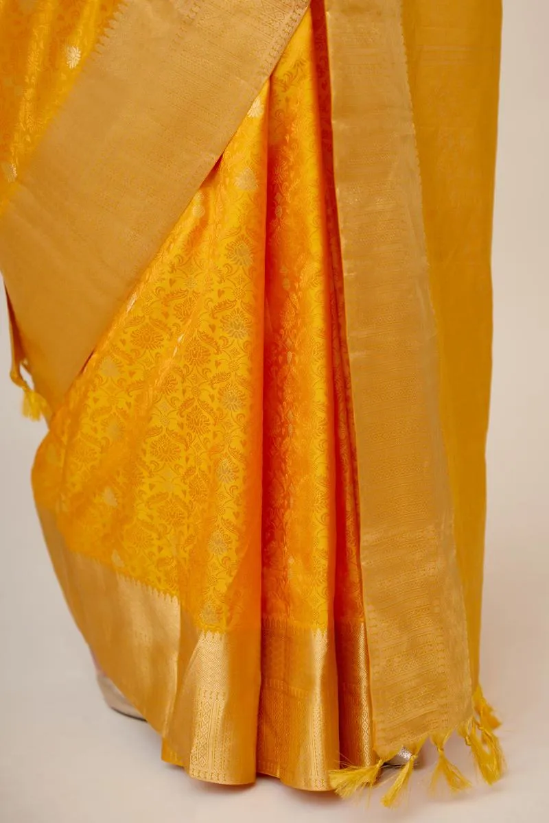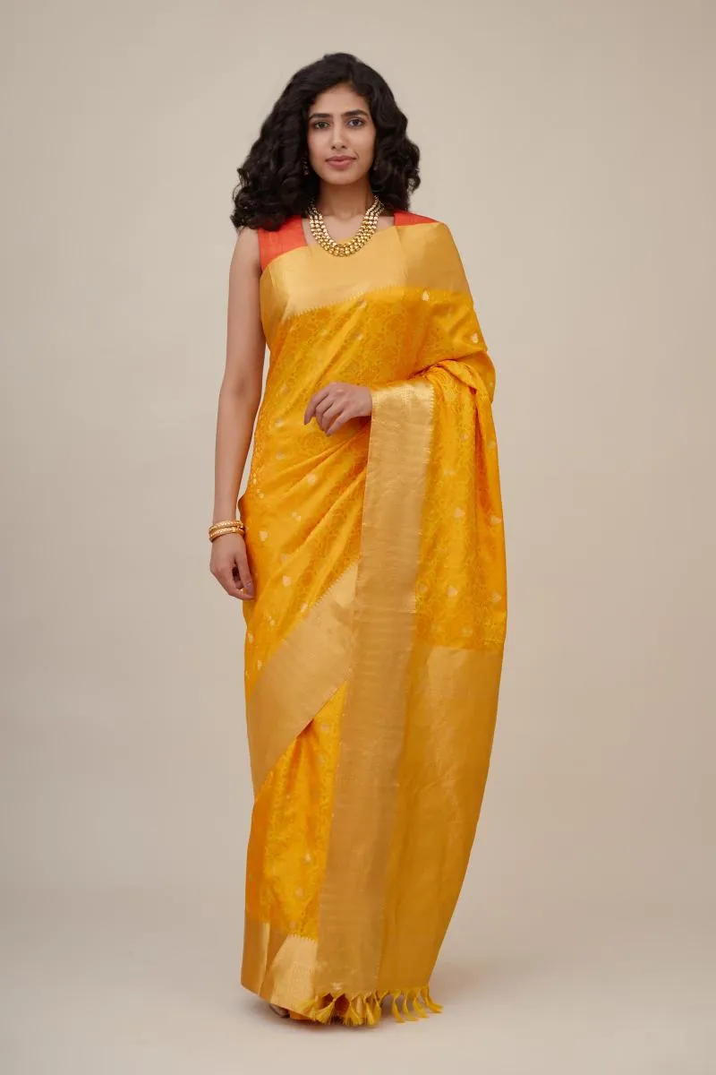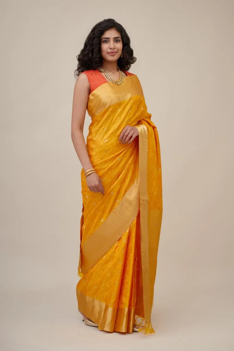 Work: floral jaal on all over the saree hihlighted with zari border tassels at palla borde self weave blouse with zari border