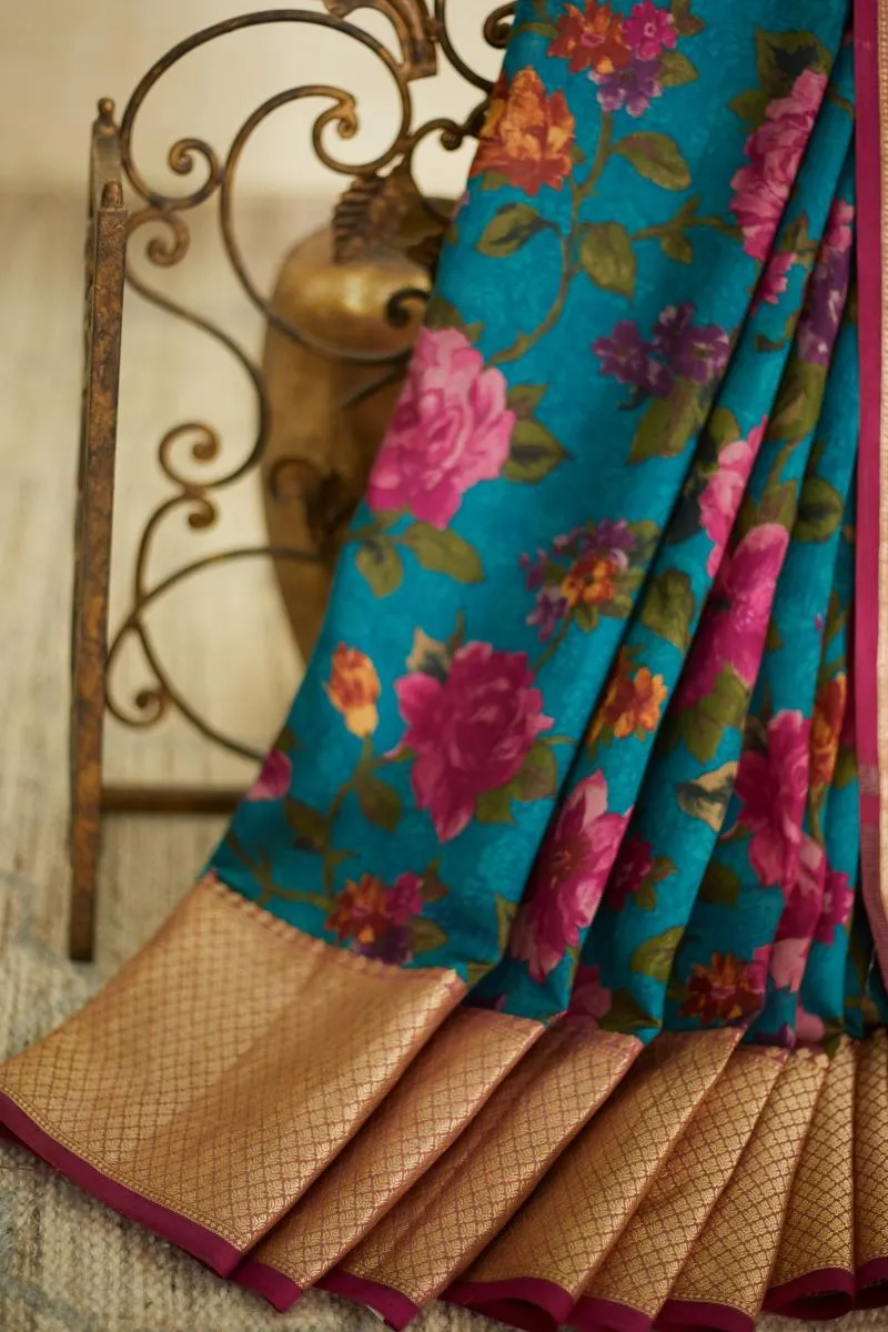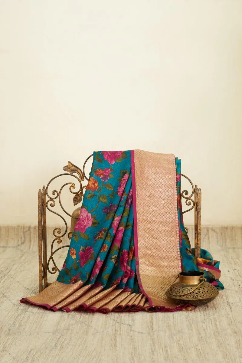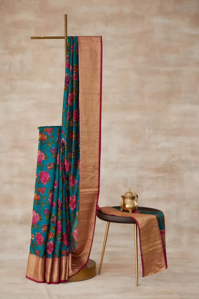 Teal Green Floral Printed Kanjivaram Silk Saree