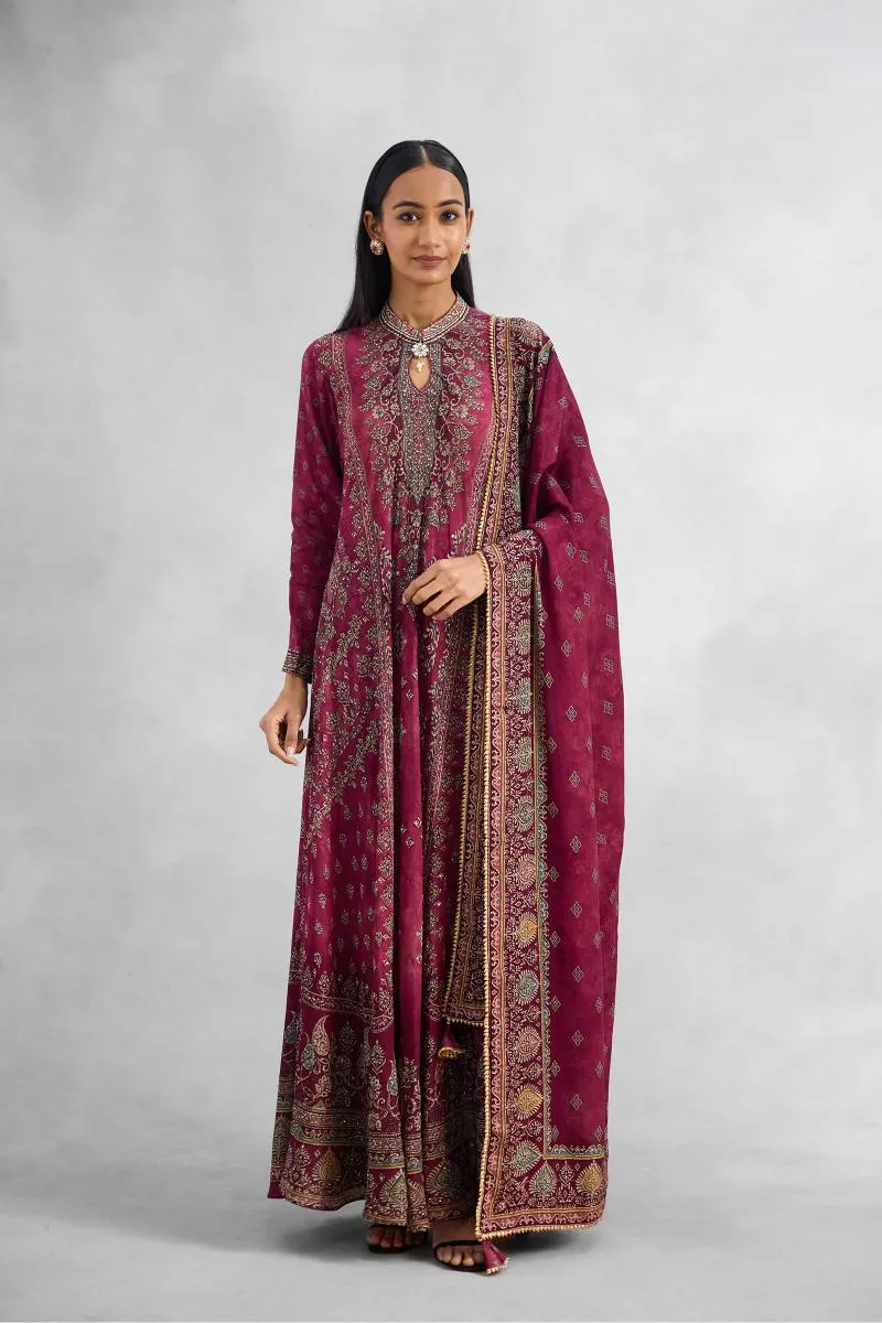 Frontier Raas features burgundy inrefined palazzo suit sets that offer comfort, ease of movement, and an elevated appearance perfect for a dress for Lohri function or a modern Punjabi Lohri dress.