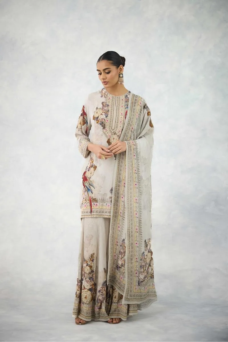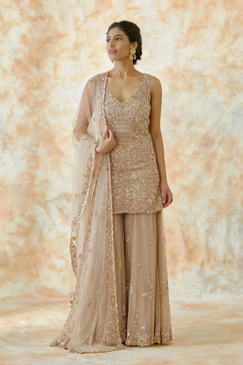 Frontier Raas designer sharara suits includes beige shades in several light and comfortable Lohri dresses that feel elegant without being overly heavy.