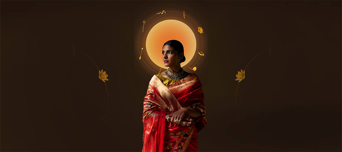and aesthetics that marry the ideologies that celebrate women in her many forms all beautiful and necessary, this Navratas delve a little deeper into self and celebrate love for your being, this is the best time to pamper yourself, perhaps adorn fresh flowers to your hair, paint your eyes with earthen soot and drape a timeless saree while you groove to the indulgent Dhak beats and release all that doesn’t serve you in this life. Rejoice for Durga is here, for she is within me and within you, for she is in the bees that buzz for sweet-sweet nectar, for she is blossoming amongst muck as a beautiful lotus, for she is in the very air we breathe, for she is- as you are!