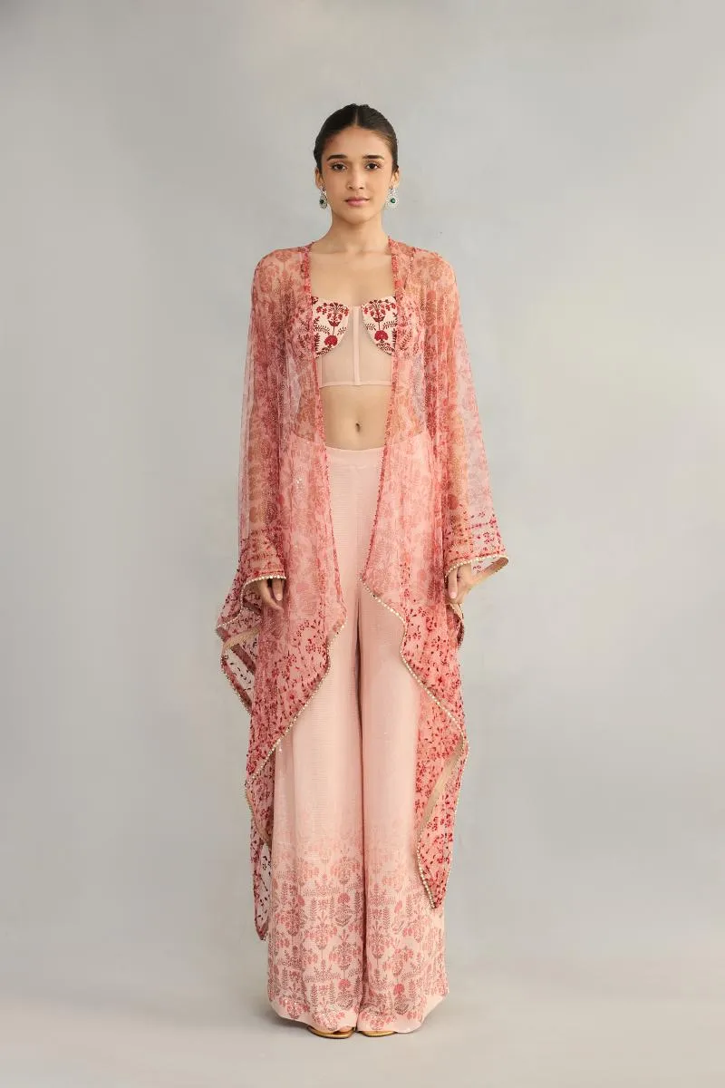 These designer cape suits for weddings combine sleek tailoring with soft, feminine detailing. The sheer embroidered cape replaces the dupatta, giving the bride a structured yet flowing silhouette, making it a favorite among modern couture brides.
