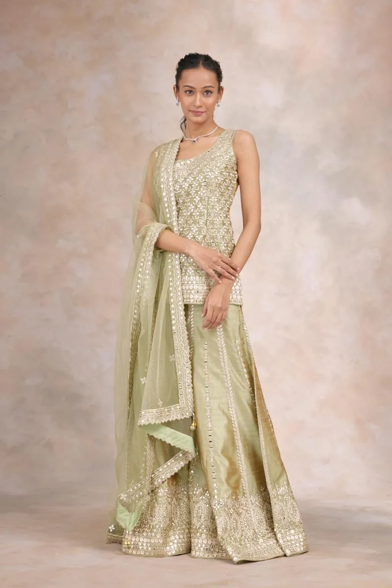 The bridal sharara suit with flared bottoms and a richly detailed kurta combines comfort with couture. Mirror work, pearls, and intricate threadwork enhance the elegance, making pastel green shararas perfect for haldi, sangeet, or daytime wedding functions.