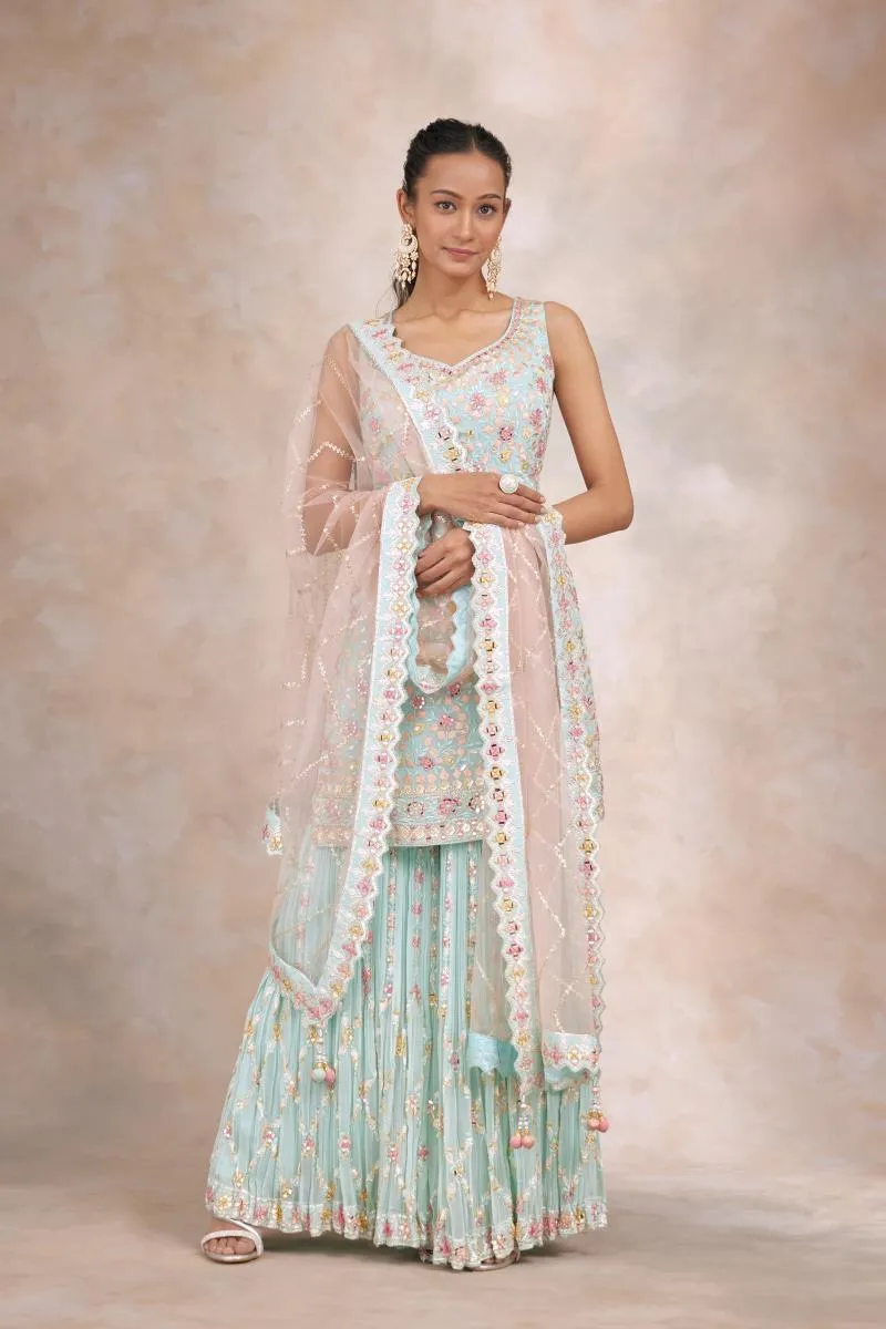 The bridal gharara suit, known for its flared pants and intricately designed kurti, offers tradition with fluid movement. This soft pastel blue palette radiates calm elegance, making it perfect for engagement ceremonies or post-wedding receptions.