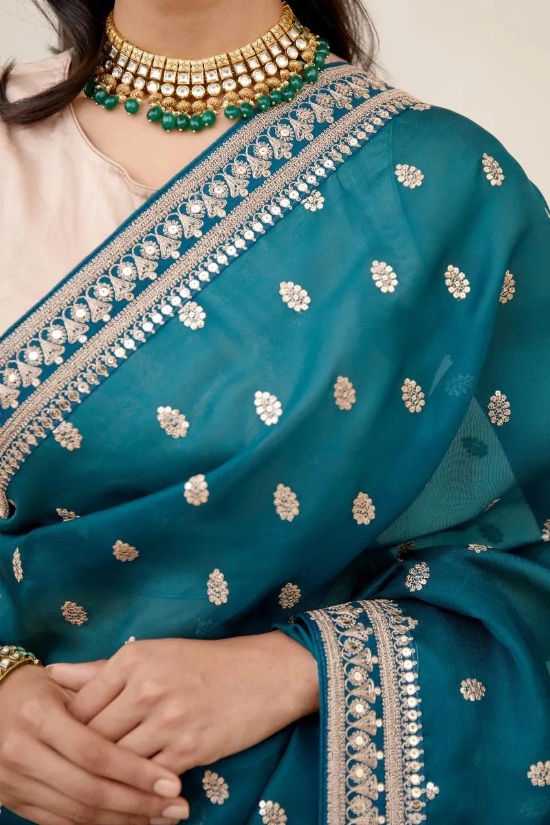Work: zari booti on all over the saree highlighted with sequins zari border with sequins plain blouse with border