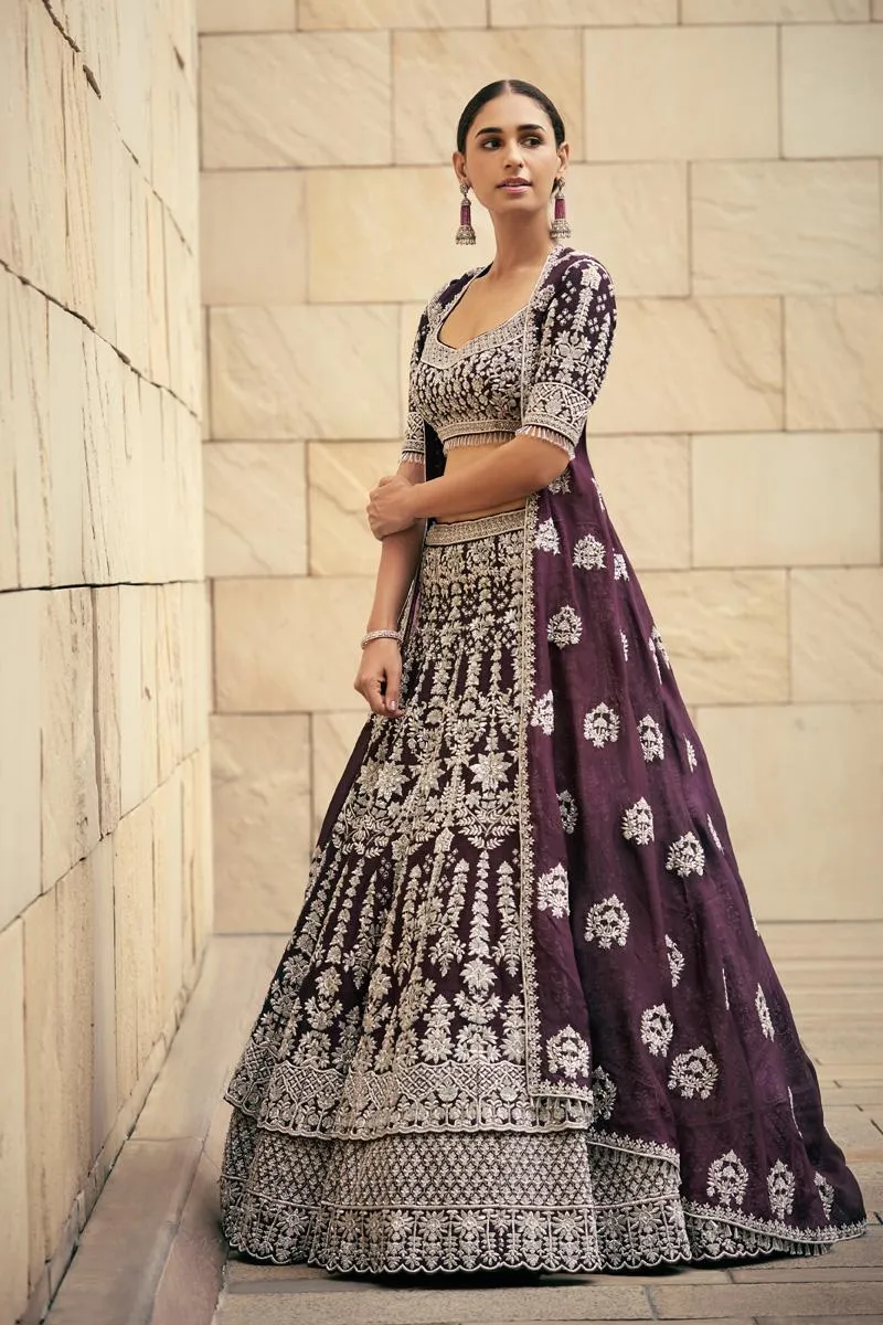 Wine raw silk blouse embroidered with silver dabka, sequence and dori work, motifs inspired by botanical designs and grids, waistline highlighted with drop crystals. Paired with wine raw silk double layer lehenga embellished with heavy silver zardozi work. Combined look with Satin organza and butti embroidery on long asymmetrical jacket.