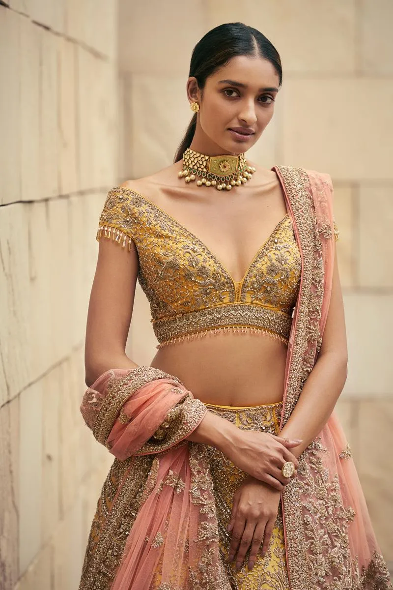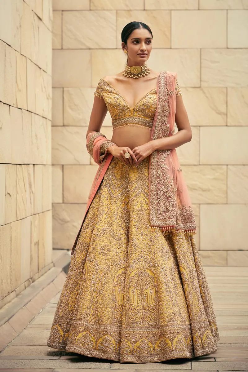Yellow raw silk deep v-neck off shoulder blouse enhanced with dabka, nakshi and pearl work, highlighted waistline and sleeve with tassels. Comes with yellow raw silk kalidar lehenga embroidery inspired by botanical and structural designs. It has a contrasting Net Peach heavy border and butties dupatta.